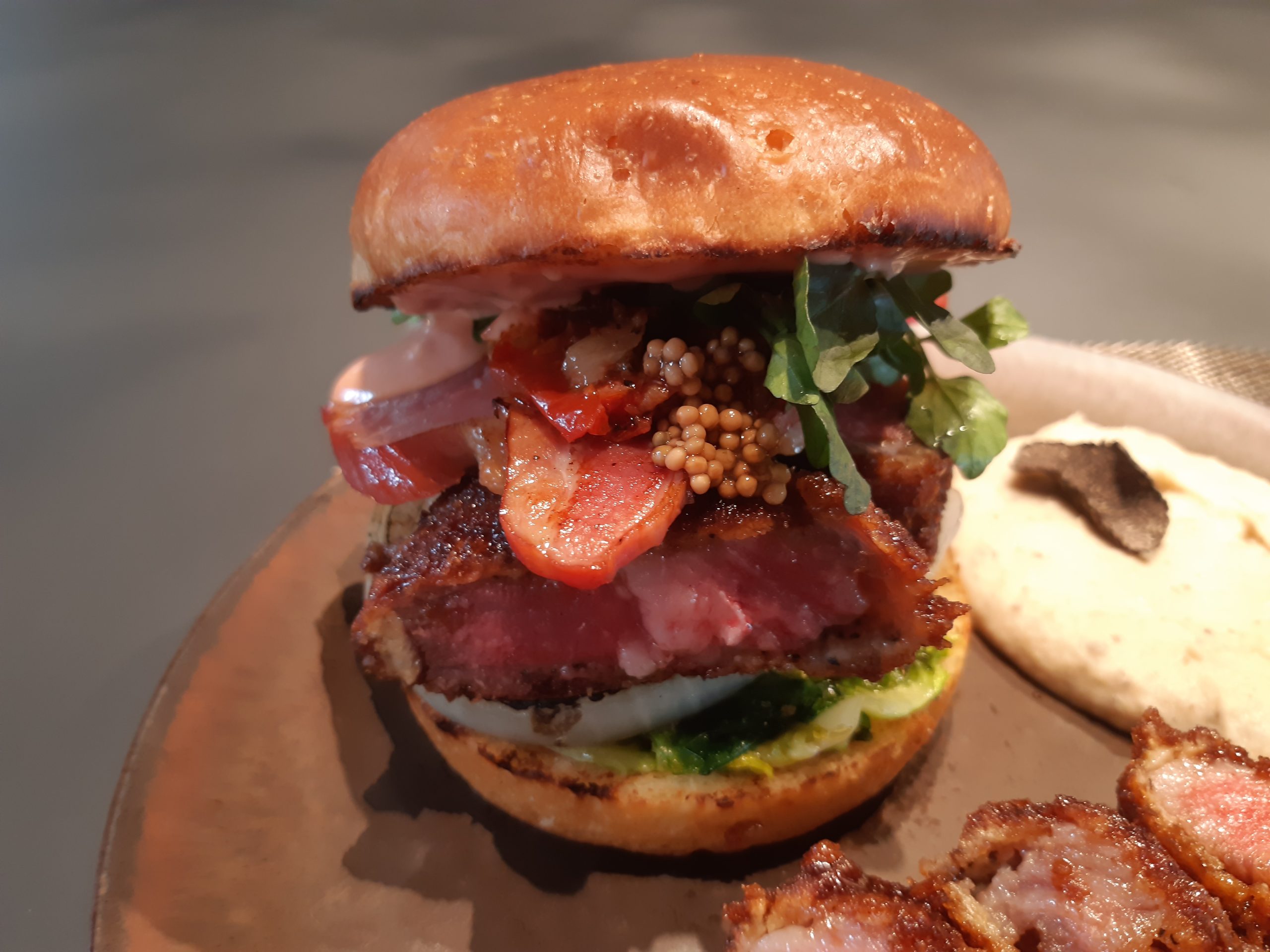 A5ランクの神戸牛リブロースを使用し、サイドのマッシュポテトの上には、高級食材の黒トリュフがテーブルでスライスされます。 このほか、香ばしくフライした芽キャベツやオニオンステーキ、熟成ベーコングリル、セミドライトマトが神戸牛と共演します。