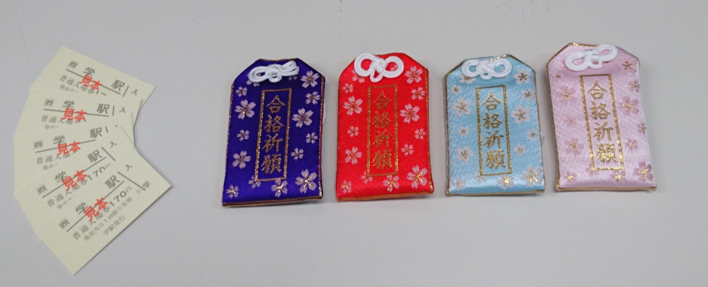 | 合格祈願きっぷ | 学駅入場券5枚(硬券タイプ)+お守り袋のセット ※ お守り袋は「紫色」「赤色」「水色」「桃色(ピンク)」の4種類 ■1セット(5枚組・お守り袋付)850円 |