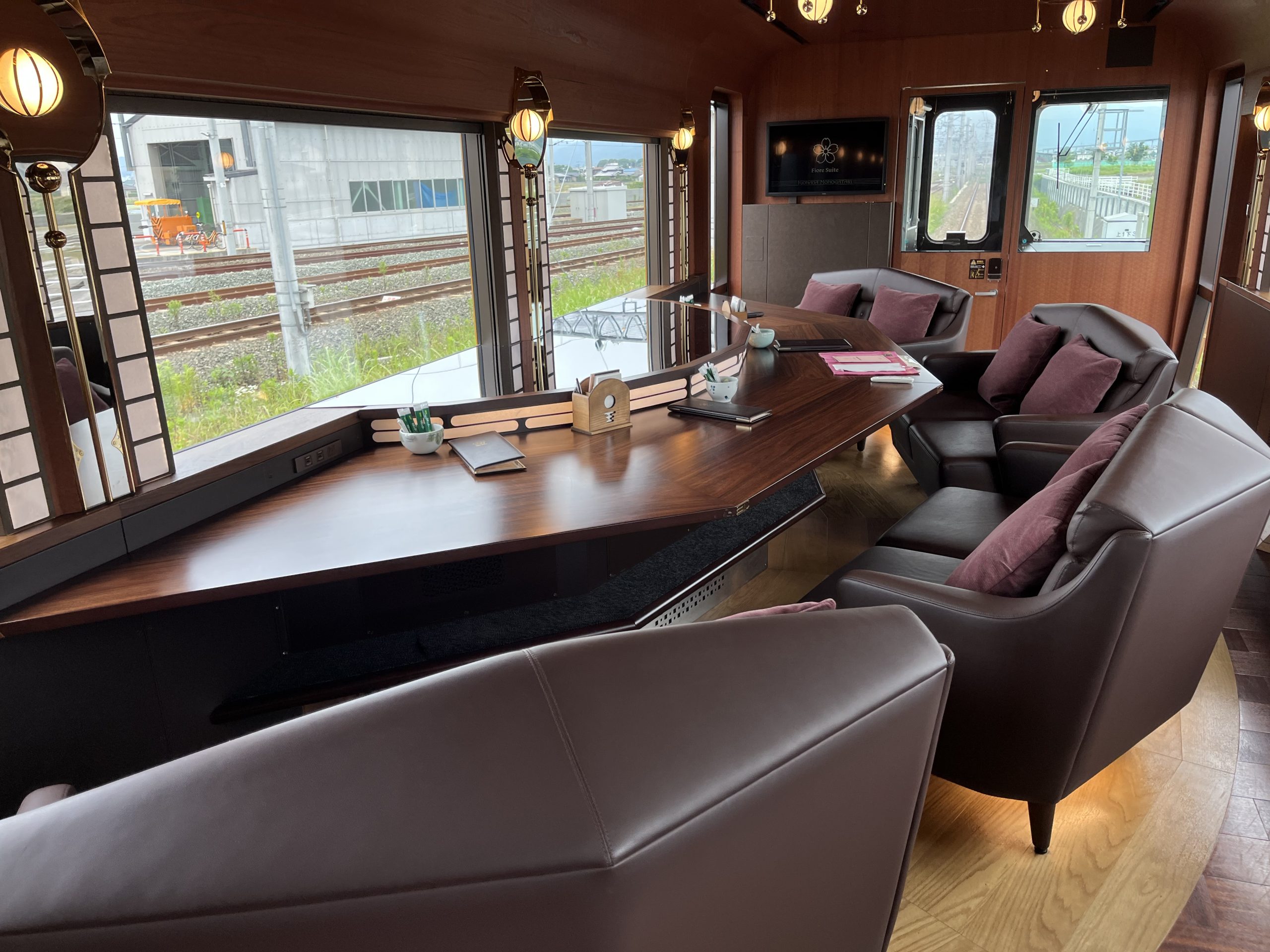 伊予灘の夕焼け空をイメージした1号車「茜の章」、太陽や愛媛の名産・柑橘をイメージした2号車「黄金の章」では、それぞれのモチーフを活かしたインテリアが鮮やかです。3号車「陽華の章」は一両をまるごと一室が占めるという贅沢なつくりで、車内にはゆったりとした空気が流れています。
