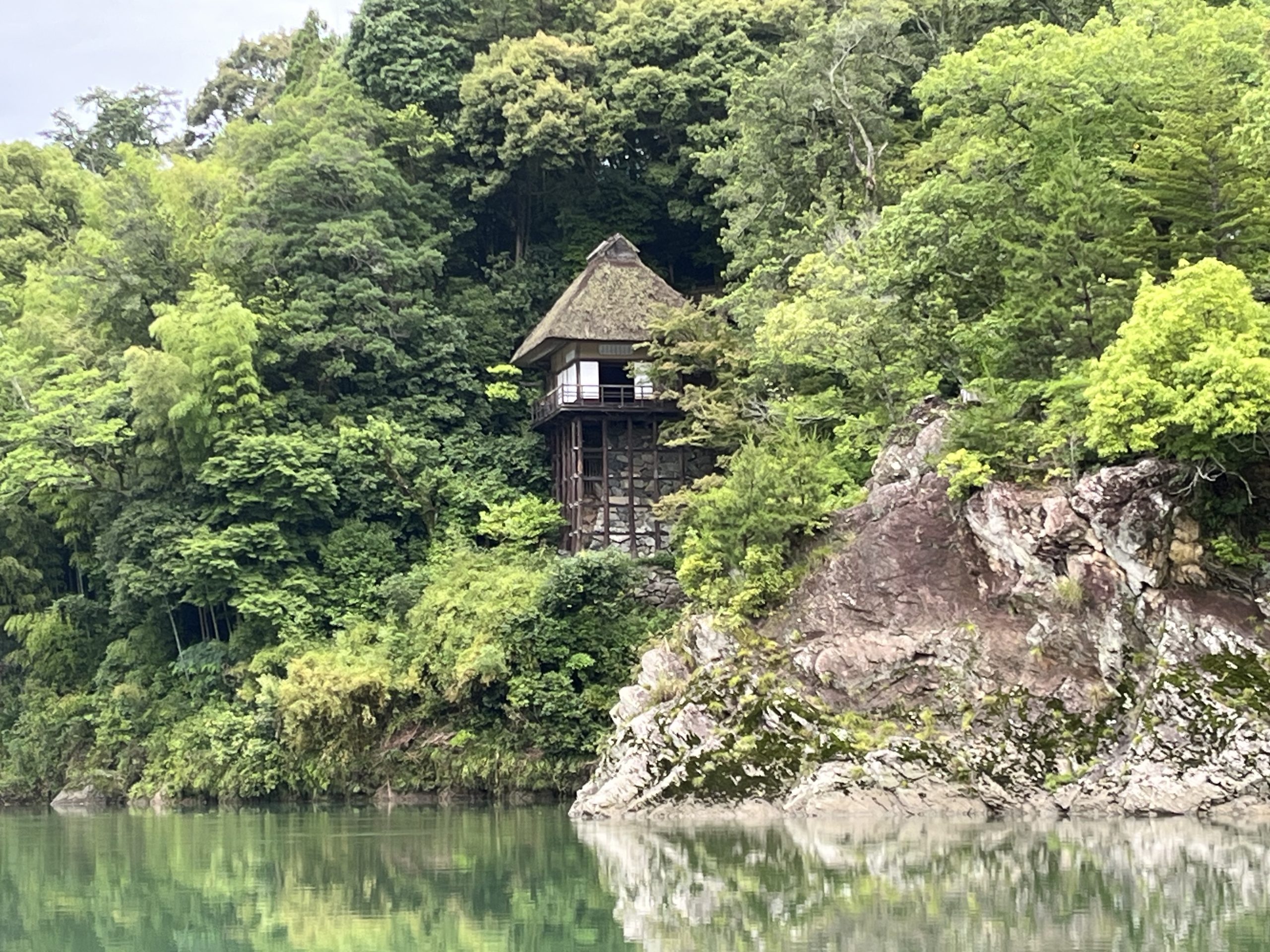 崖の上にある懸り造りの建物「不老庵」は、対岸から昇る月の光を天井に反射させることで部屋全体を幻想的に照らし出すなど、巧妙な仕掛けが施されています。