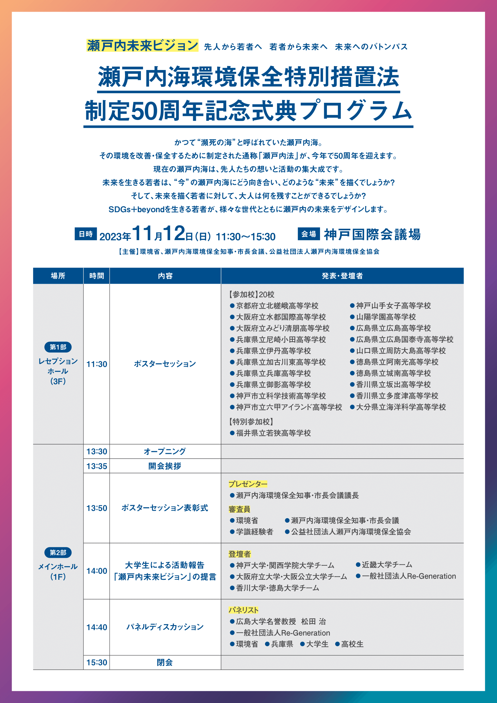 通称「瀬戸内法」が制定50周年を迎えるにあたり、豊かで美しい里海としての瀬戸内海の重要性を認識し、景観、文化、食など豊富な地域資源を有する瀬戸内海の魅力を広く発信するとともに、次世代を担う若者の提案による、瀬戸内海の未来に向けた持続可能な取り組みについて皆様方と考えるため、「未来へのバトンパス」をテーマとした記念式典を開催します。