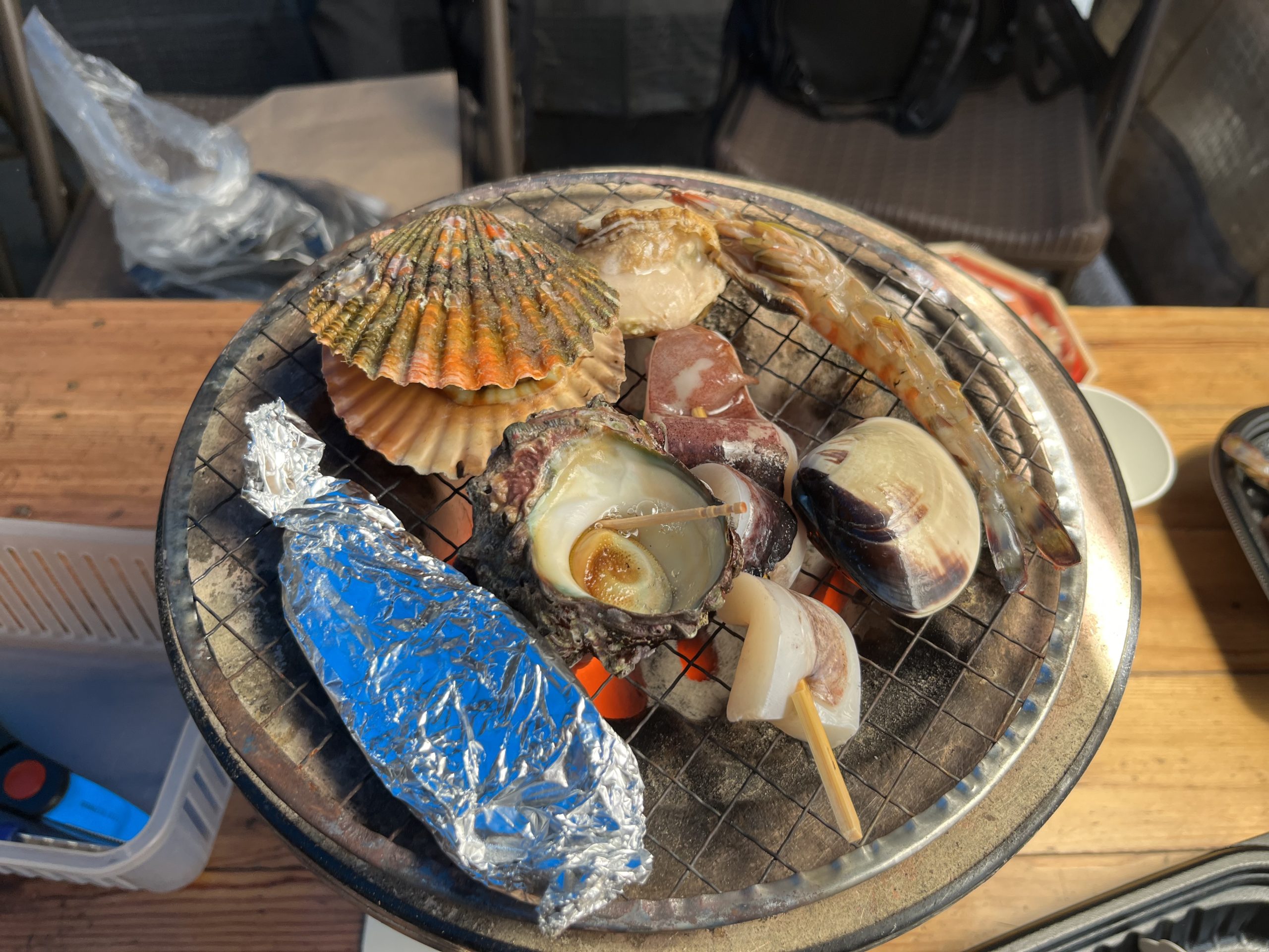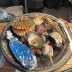 パチパチと音を立てながら焼き上がる魚介類。食べごろになれば醤油を垂らしていただきます。プリプリの食感と磯の香りが存分に味わえます。