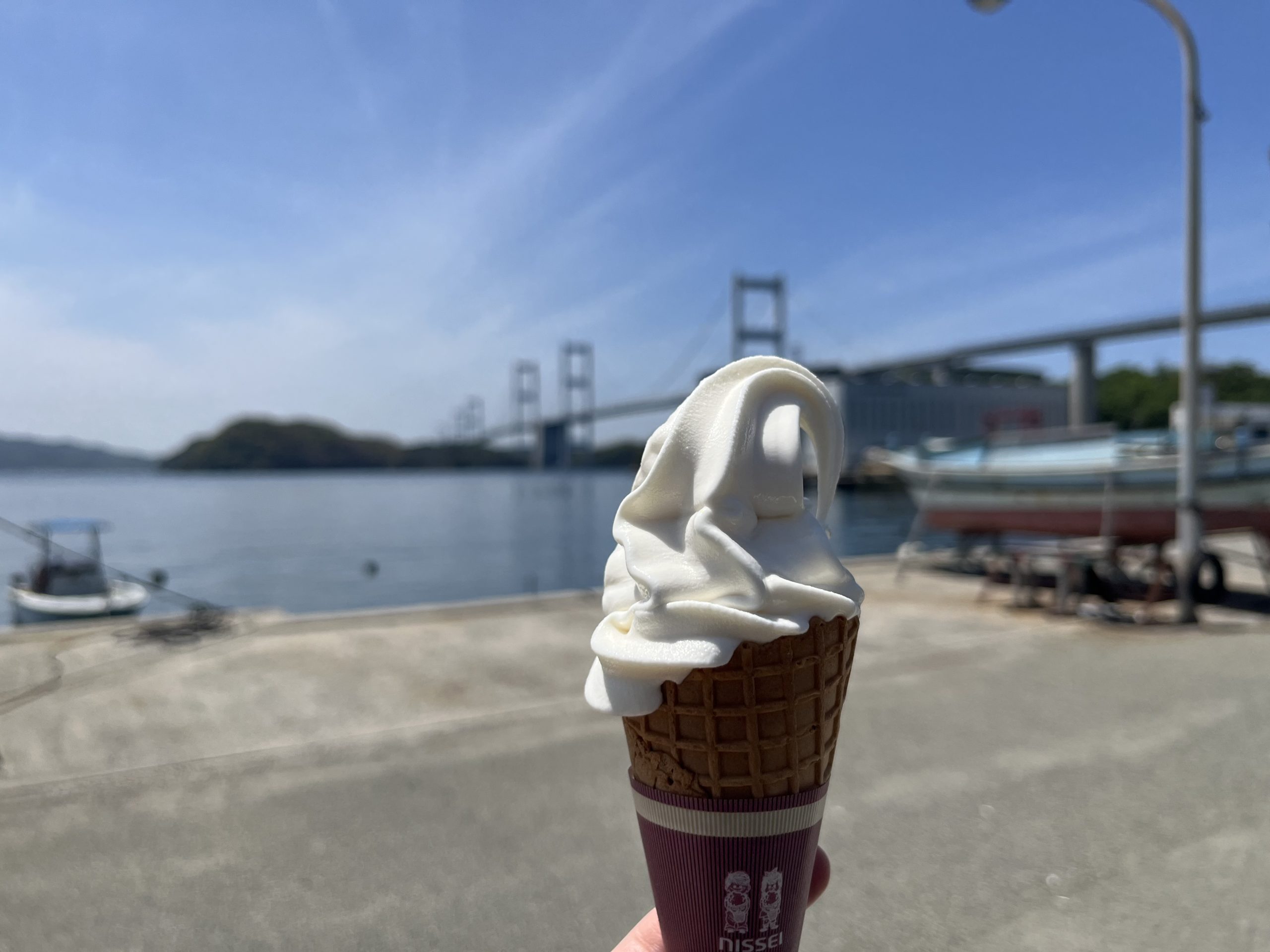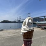 バーベキュー場は海に面していて、目の前は来島海峡大橋を望む絶景スポット。食後は壮大な景色を眺めながらの伯方の塩ソフトクリームをいただきます。