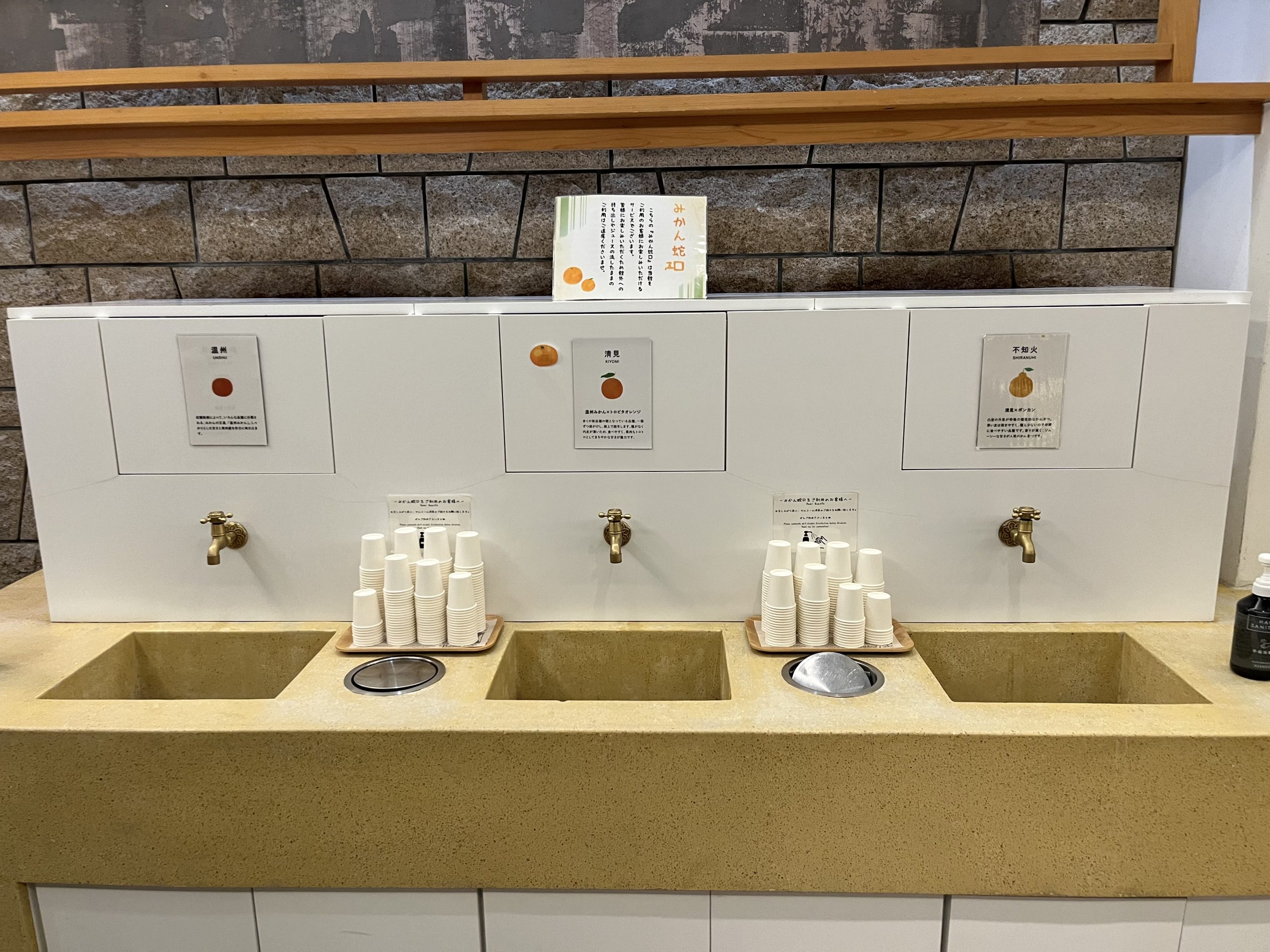 エントランスでは、愛媛の柑橘を味わえる3種類のジュースが注げる魔法の蛇口がお出迎え。