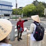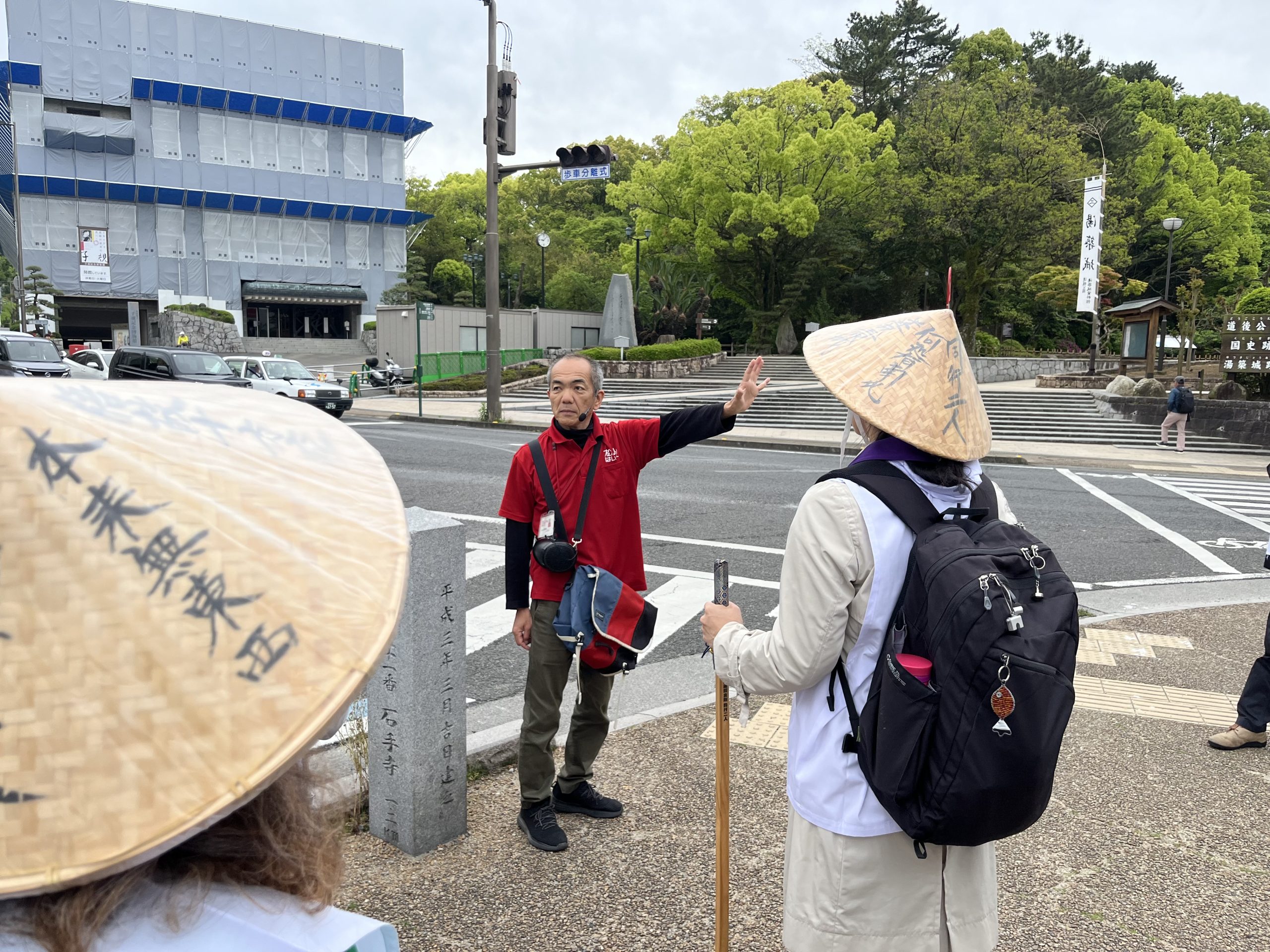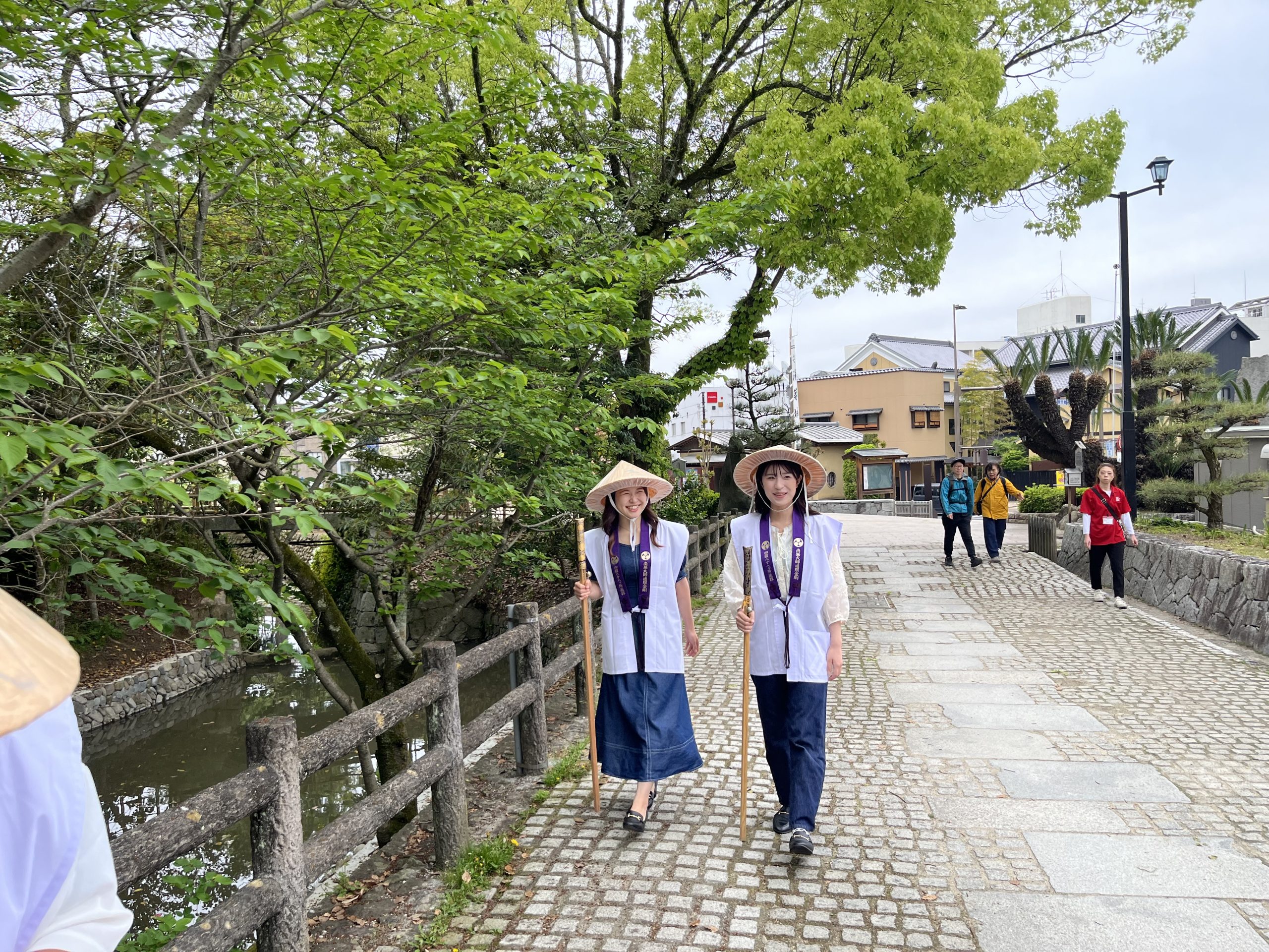 午前9時、道後温泉駅近くの「松山はいく」で遍路装束4点をレンタル(菅笠、金剛杖、袖なし白衣、輪袈裟)