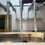 道後温泉駅北西にある道後温泉第4分湯場では、複数の源泉がブレンドされ、流れ落ちる様子を見ることができます。