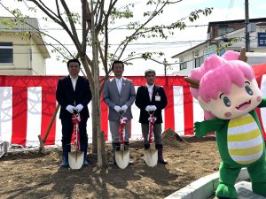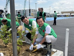また、新店舗の地、大阪狭山市の市木である「サクラ」も植えられ、オープンを記念して古川照人市長も参加し、土掛けが行われました。