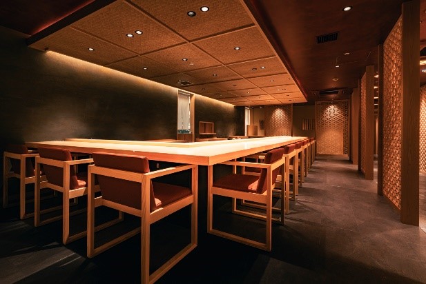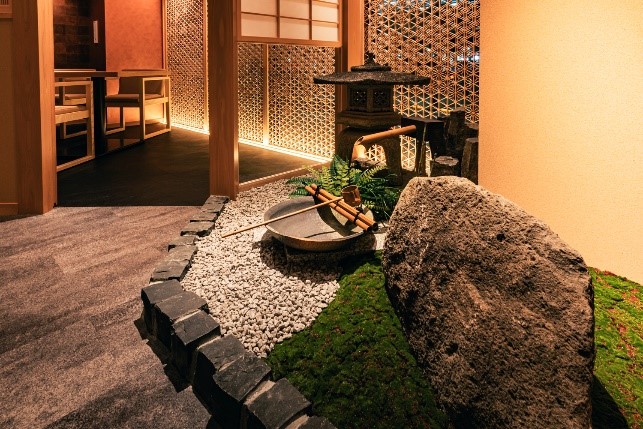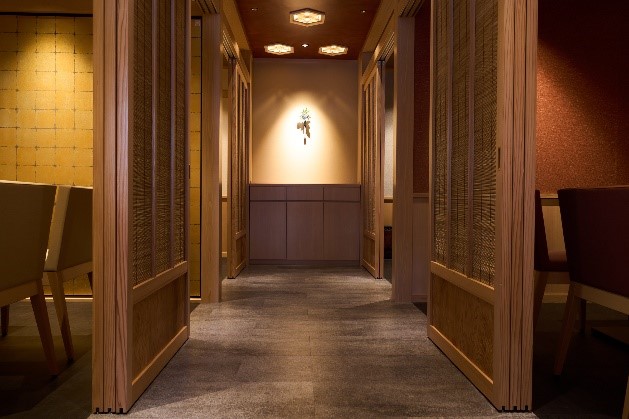 店内いたるところに、組子細工や和紙を使用した装飾が施され、日本の伝統を感じられる洗練された空間が演出されています。また、スタッフ全員、ANAビジネスソリューション株式会社がおこなう接客研修に参加するなど、「おもてなし」の文化を味わってもらえるような空間づくりを丁寧におこなっているとのことです。