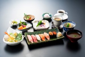 メニューは、和食を初めて味わう人も迷うことなく楽しめるように「おまかせで。」と頼めるようなコースを、ランチ・ディナーそれぞれ3コースずつ展開。ディナーコースの一部には和牛すき焼きをメニューが組み込まれるなど、寿司だけでなく総合的な日本食体験を楽しむことができる工夫が施されています。さらに、京都の地酒をはじめ、多様な銘柄の日本酒が味わえるドリンクメニューも取りそろえられており、飲み比べなども楽しめるとのことです。
