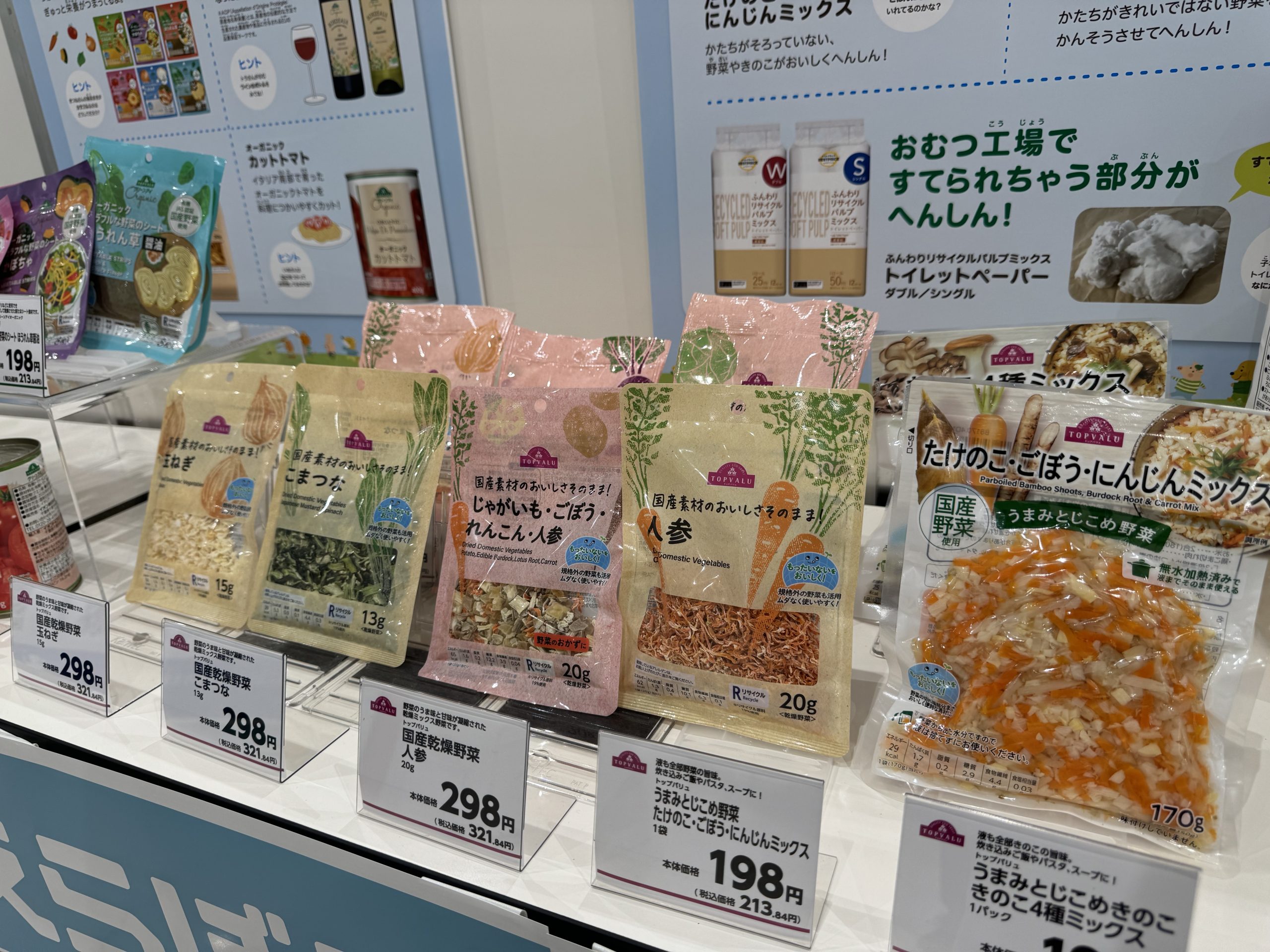 「二重構造」にした商品や、形が不揃いなどを理由に捨てられていた野菜を活用した商品など、多数の「リデュース・リユース・リサイクル」を意識した商品が展開されています。