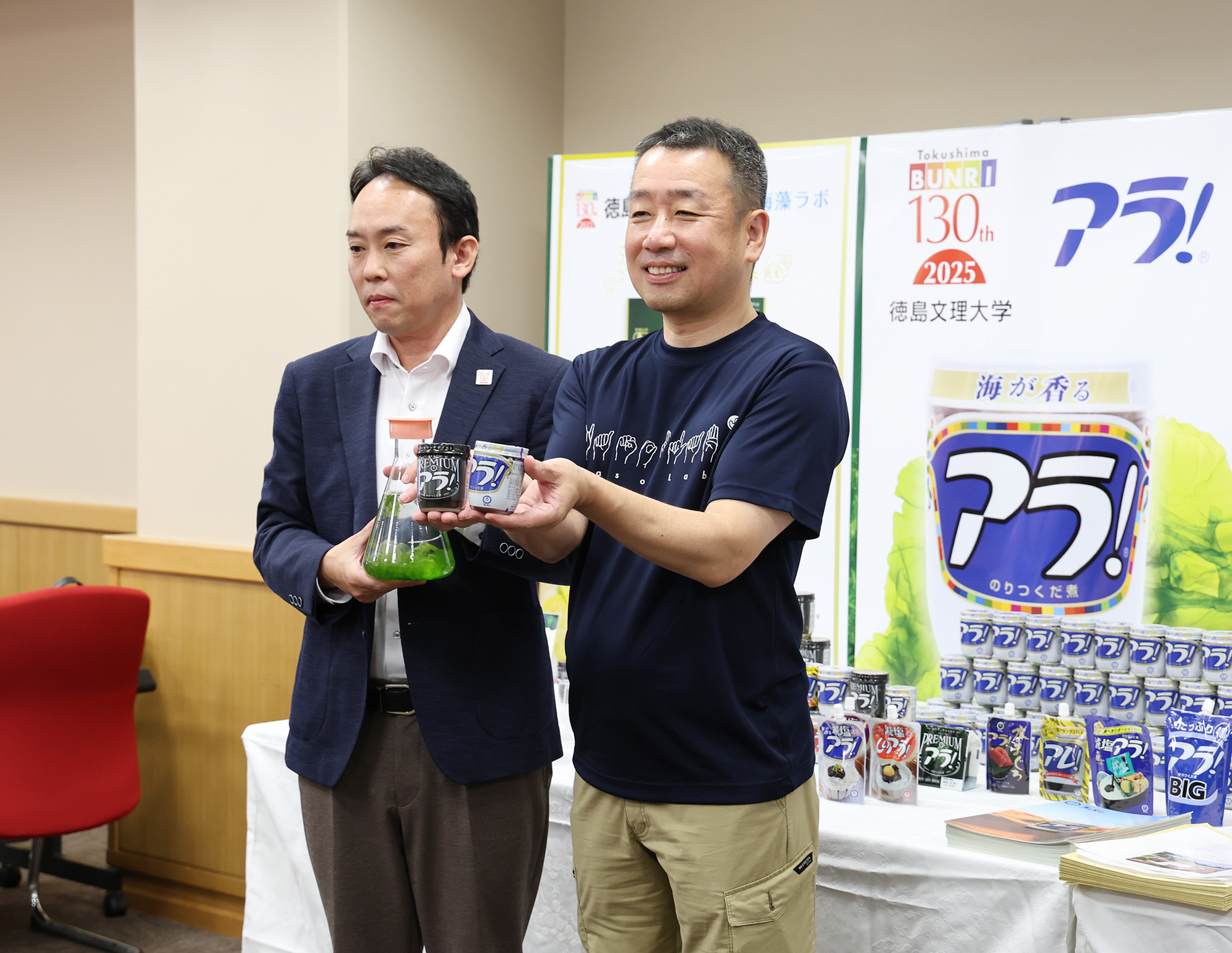 徳島文理大学(徳島県徳島市)と、ブンセン株式会社(兵庫県たつの市、以下「ブンセン」)、海藻ラボ株式会社(徳島県海部郡海陽町、以下「海藻ラボ」)が11月14日、徳島文理大学で合同記者会見を開き、食品ロスや海の環境問題の解決策へと繋がる「環境調和型の持続可能な陸上養殖技術」を活用し、ブンセンが製造販売するのりつくだ煮の「アラ!」の原料の一部に「陸上養殖あおさのり」を採用すると発表しました。