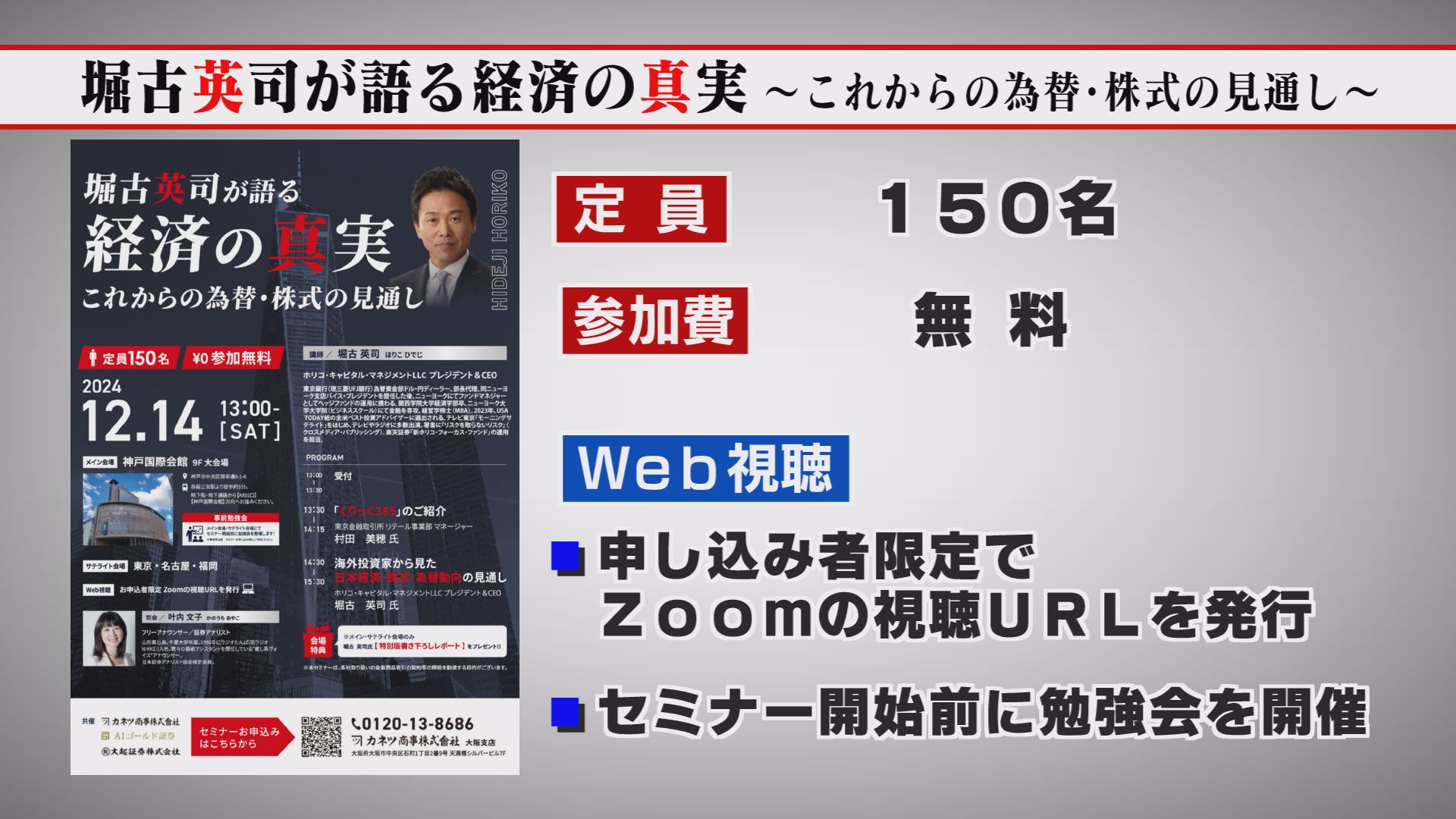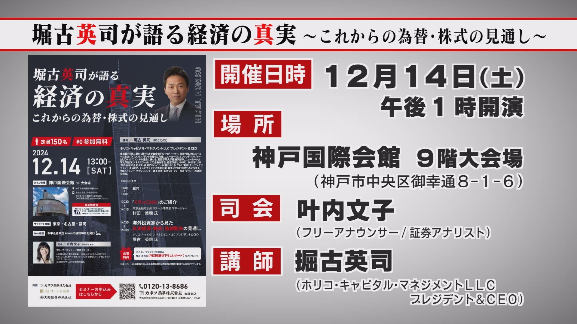 2024年12月14日午後1時から、神戸国際会館で「堀古英司が語る経済の真実~これからの為替・株式の見通し~」が開催されます。