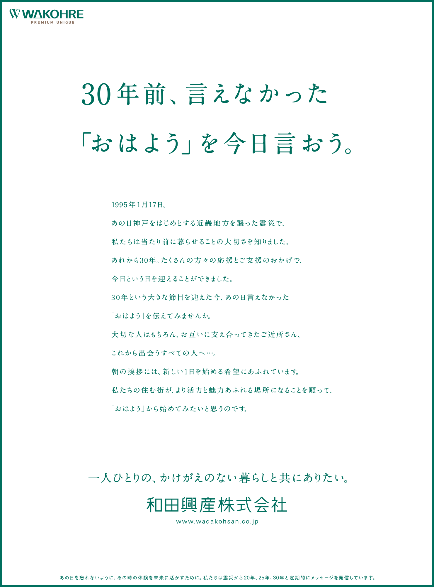 神戸市中央区に本社を構える総合不動産企業「和田興産」は、あの日を忘れないように、そしてあの時の体験を未来に活かすためにとメッセージを発信した。