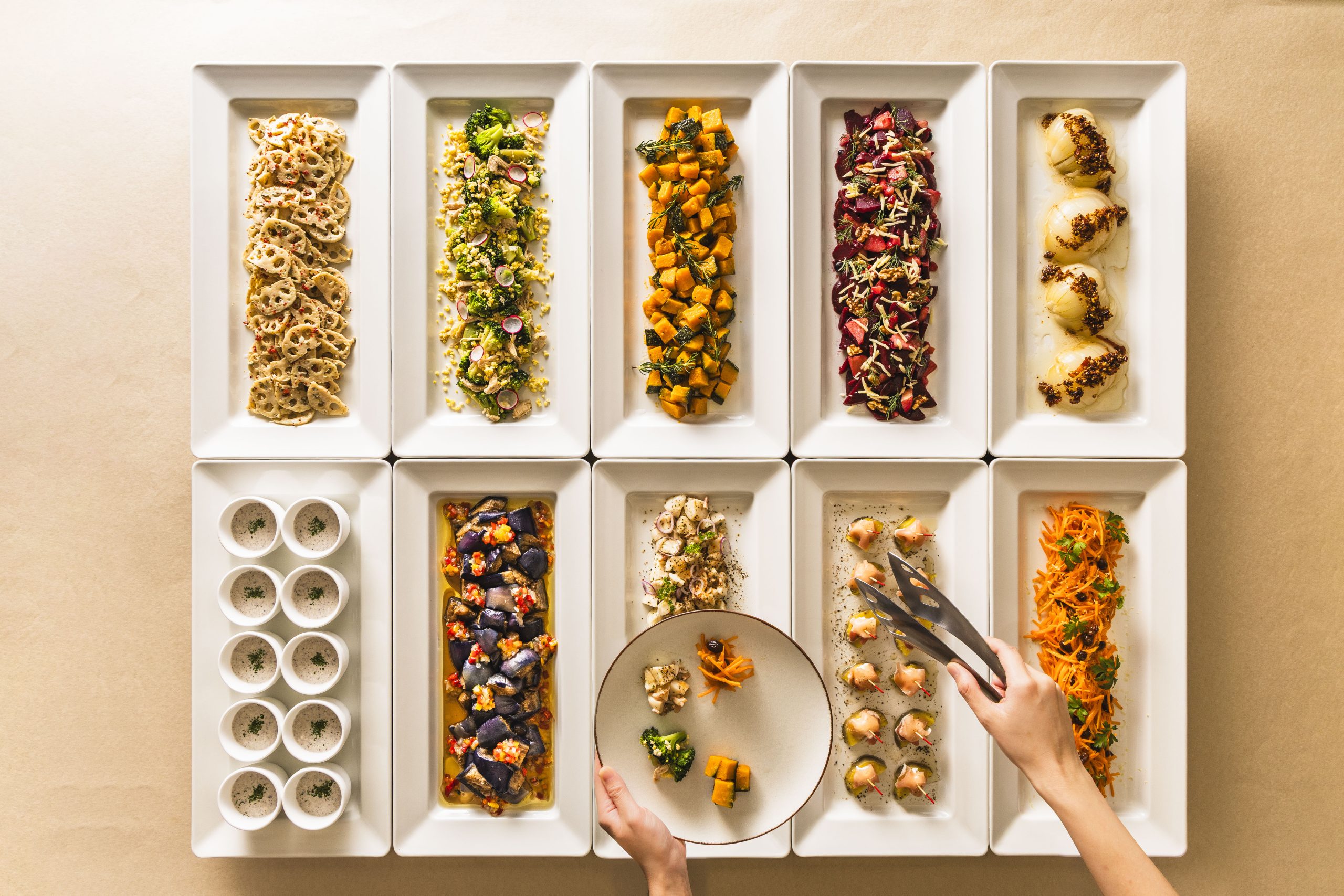 「バラエティー豊かな和・洋・中の料理&デザートと“美味しい野菜”を少しずつ、たくさん」という店舗コンセプトのもと、かぼちゃや茸、さつまいもなど秋らしい野菜を使ったベジタブルメニューが豊富に取り揃えられています。