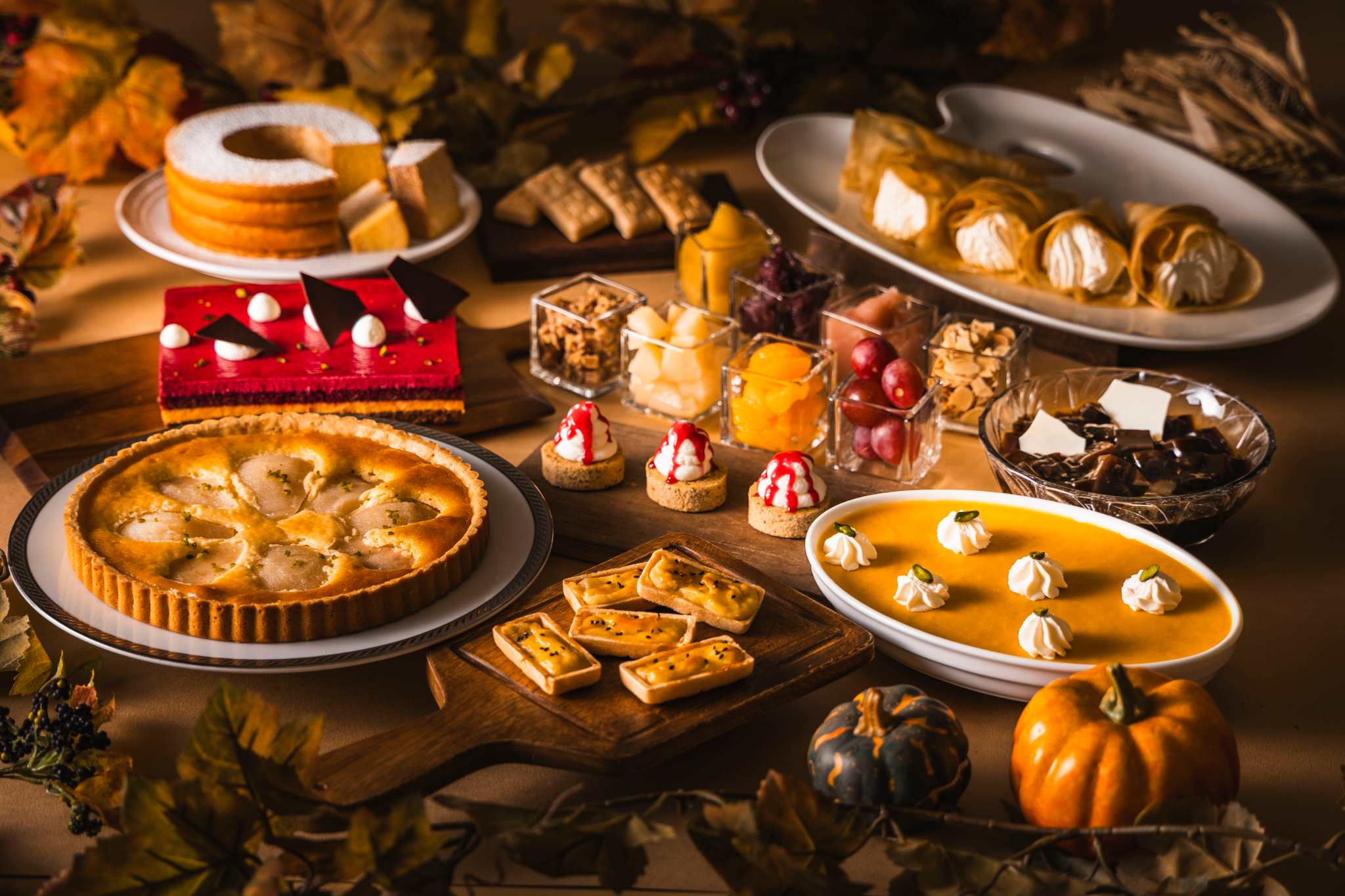 目の前で切り出すローストポーク(ランチ限定)や鮭のパイ包み(ディナー限定)をはじめ、ビーフステーキ・にぎり寿司・天ぷらなどのライブメニューや、「洋梨のタルト」や「かぼちゃのプリン」など秋の味覚を味わうデザートまで約60種類のメニューが食べ放題!