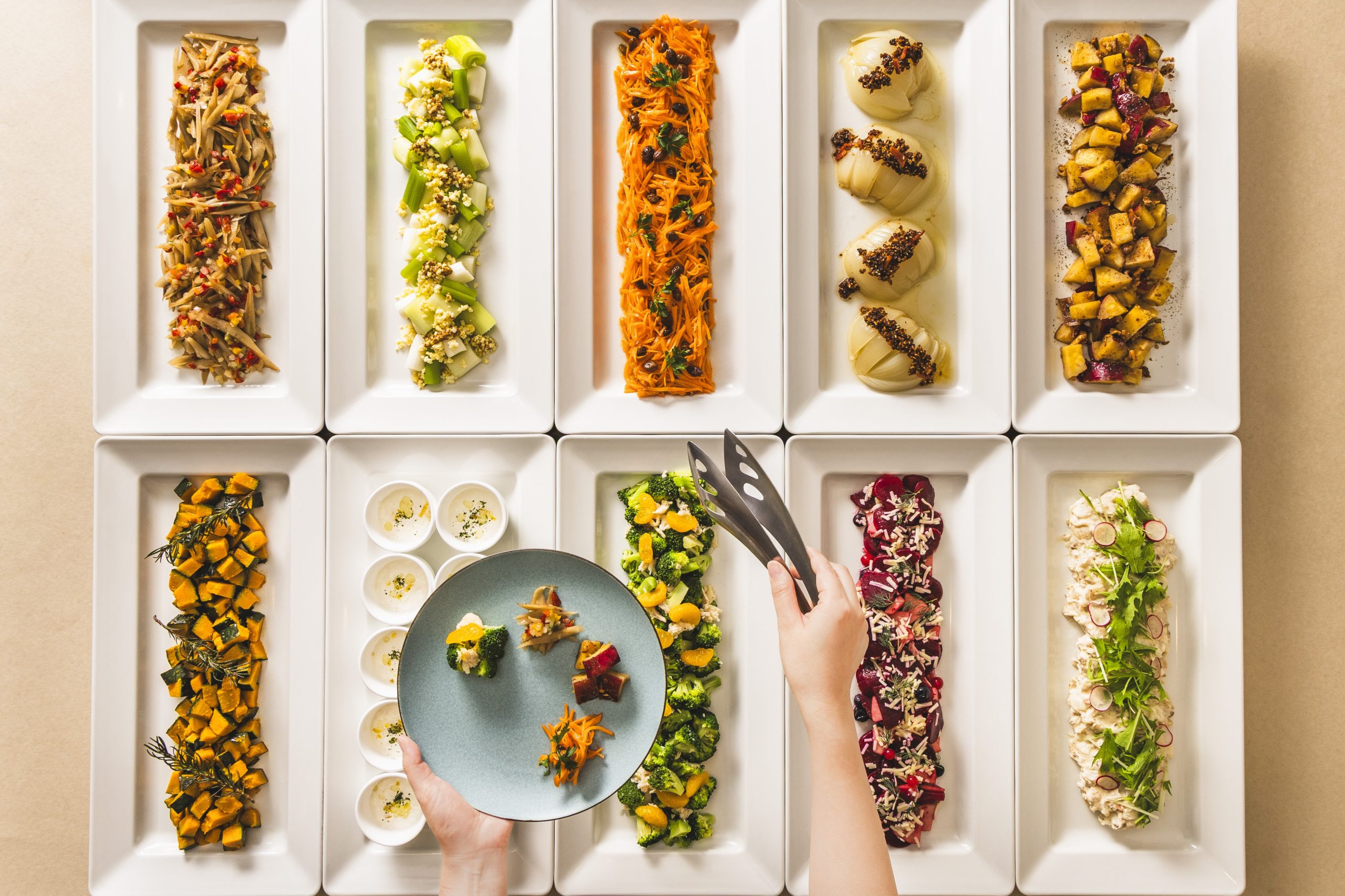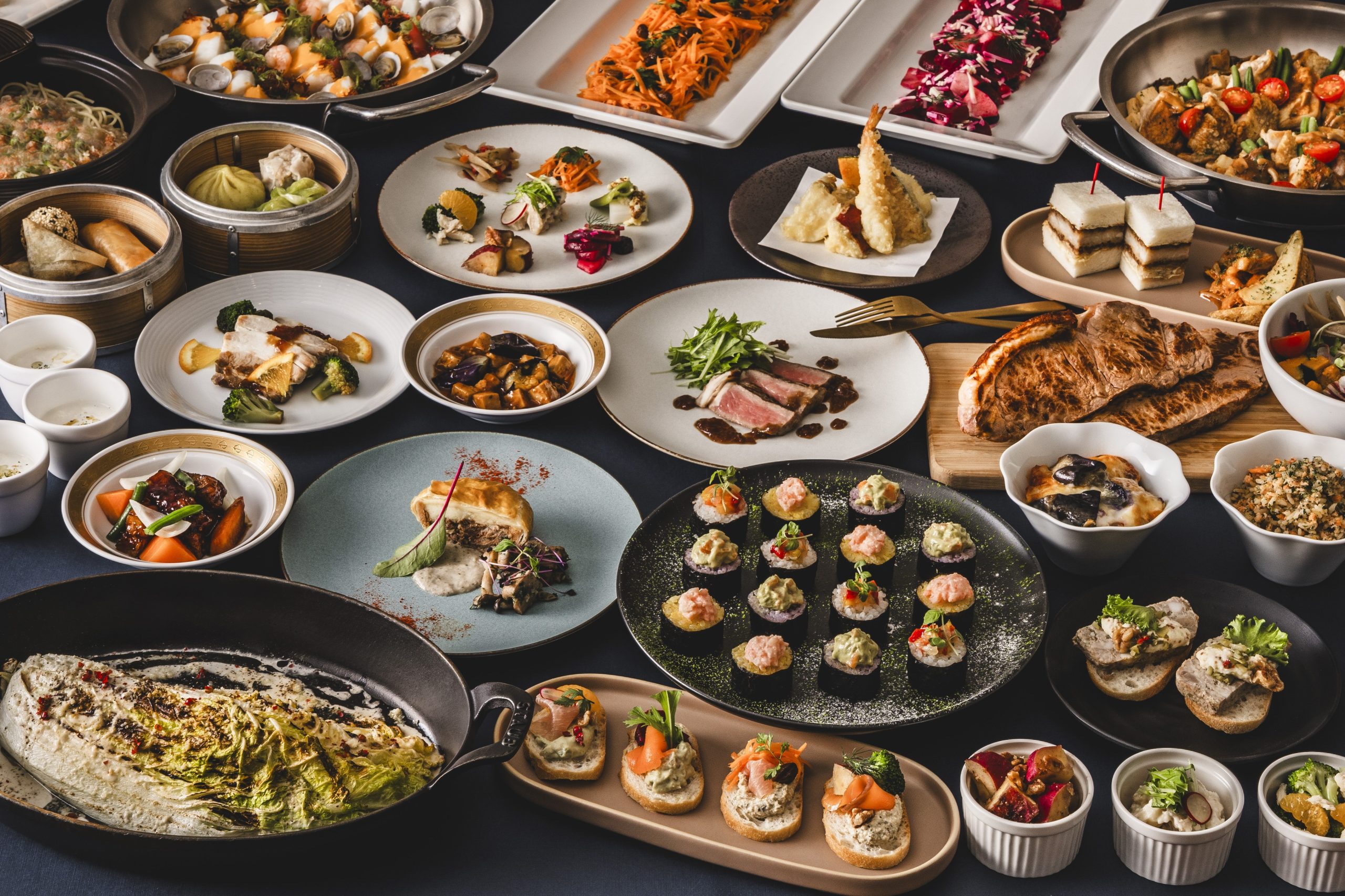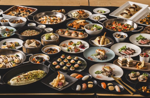 「ネン」のコンセプトである “美味しい野菜”を楽しむ10種のカラフルオードブルや野菜の巻き寿司に出来たての美味しさを楽しむビーフステーキやにぎり寿司、「蟹と玉子の餡かけラーメン」などバラエティー豊かな和・洋・中の料理をご堪能いただけます。