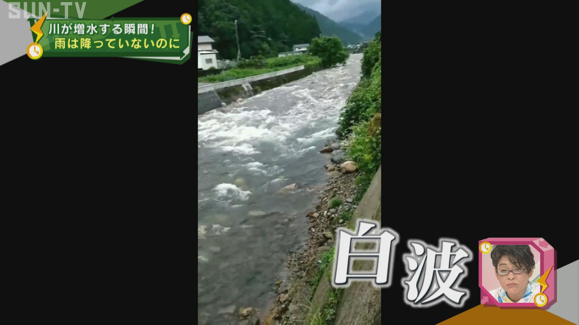 映像を見ると、この場所では雨が降っていませんが上流から白波が迫ってきています。