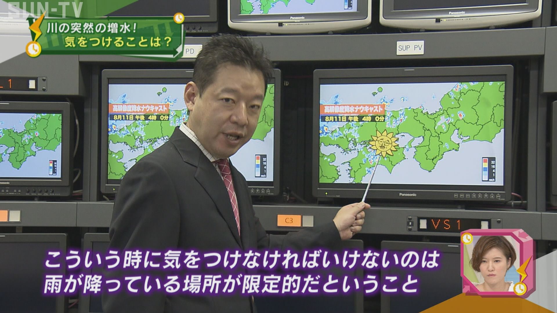 広く降っているわけでありませんので、今自分がいる場所で雨が降っていなかったとしても、少し離れているところにもくもくとした雨雲がわいているとか、雷の音が聞こえるとか。そういった時は、一気に川が増水するような雨が離れたところで降っていることが考えられますので、十分に注意してください」