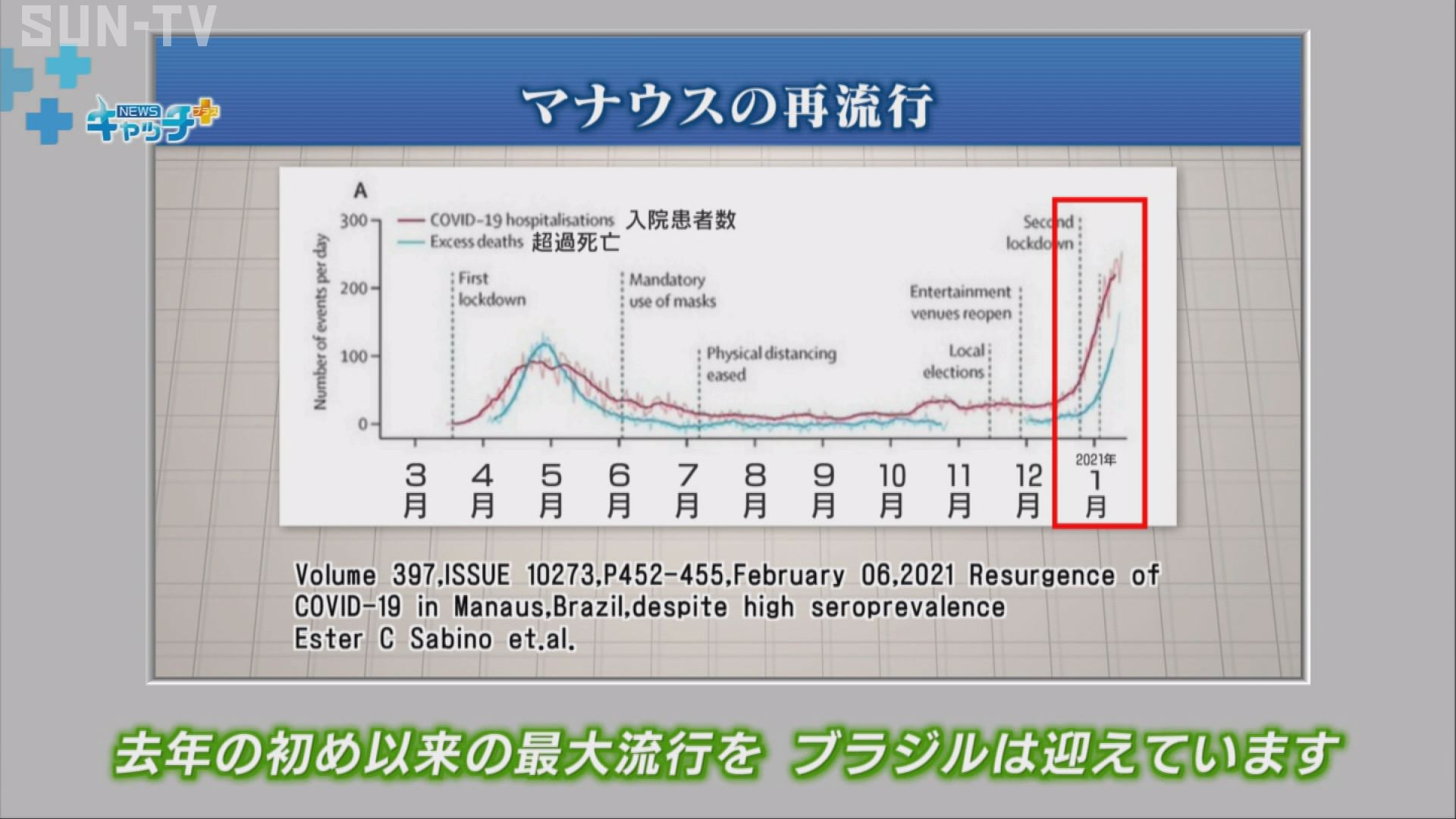 ブラジルマナウス市で、去年12月の時点で75%の方が感染してしまっている状態で、集団免疫達成と喜んでいたんですけど、実はそれが12月時点だったんですけど、1月から大流行していまして、自分が共同研究している都内の友人がブラジルとテレカンファレンス(遠隔会議)しているんですけど、去年の初め以来の最大流行を実はブラジルは迎えています。