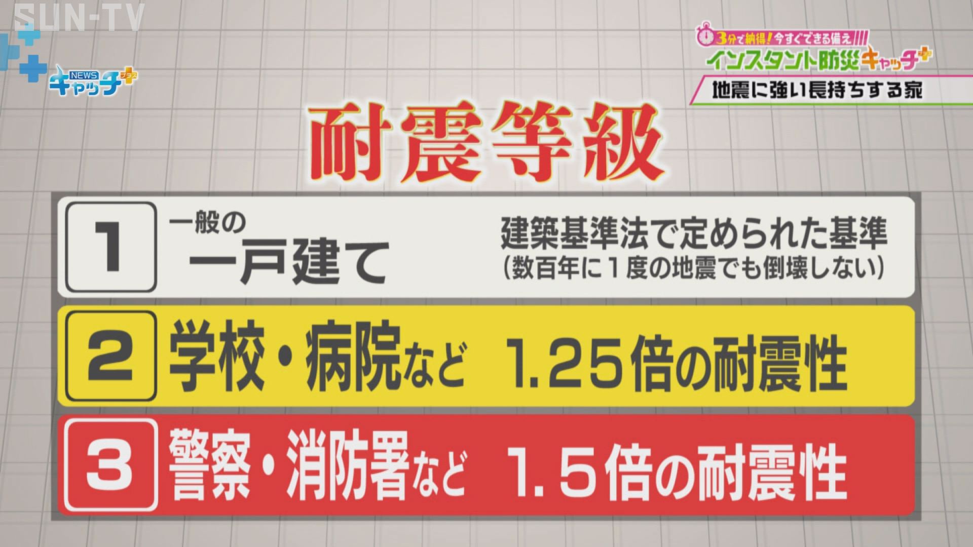 耐震性を表す指標が耐震等級。1から3の3段階で、1は建築基準法で定められる最低限の基準です。