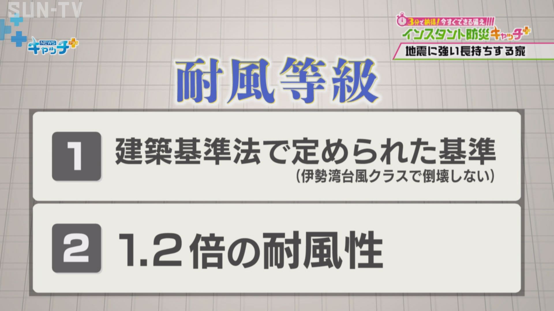 耐震等級3、耐風等級2が災害に強い家のひとつの指標です。