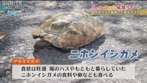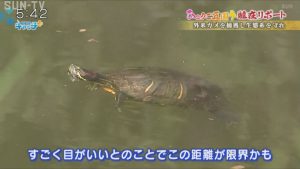 松本カメラマン「いました!カメがいましたよ!」「大きいカメいますね。」「目がいいとのことでこの距離が限界いかも、オッ逃げちゃった」「ちょっと体を動かしただけなんですけど、逃げてしまいましたね」
