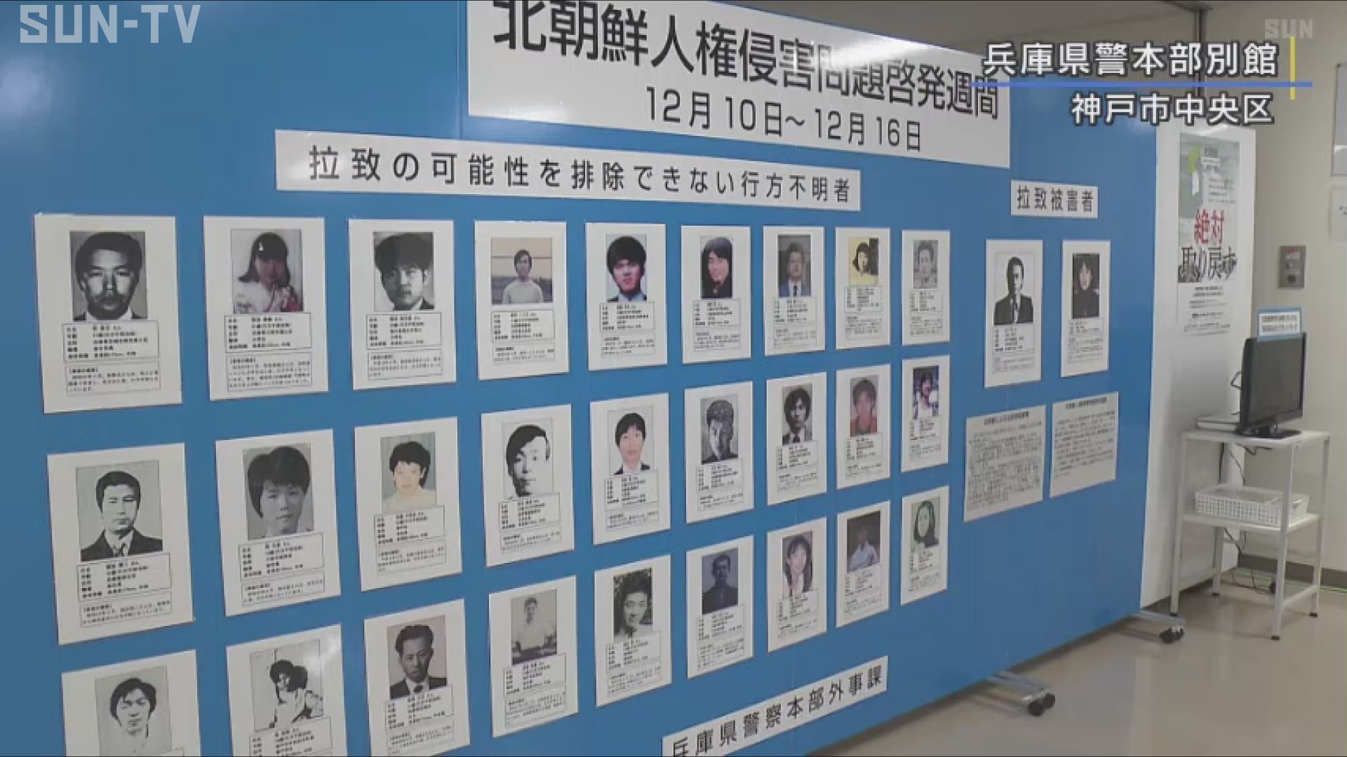 このパネル展は10日から全国で始まる「北朝鮮人権侵害問題啓発週間」に合わせて兵庫県警が開くもので、会場では、兵庫県に関わりのある拉致被害者や拉致された可能性が排除できない特定失踪者ら合わせて29人の顔写真や失踪の経緯などが紹介されています。