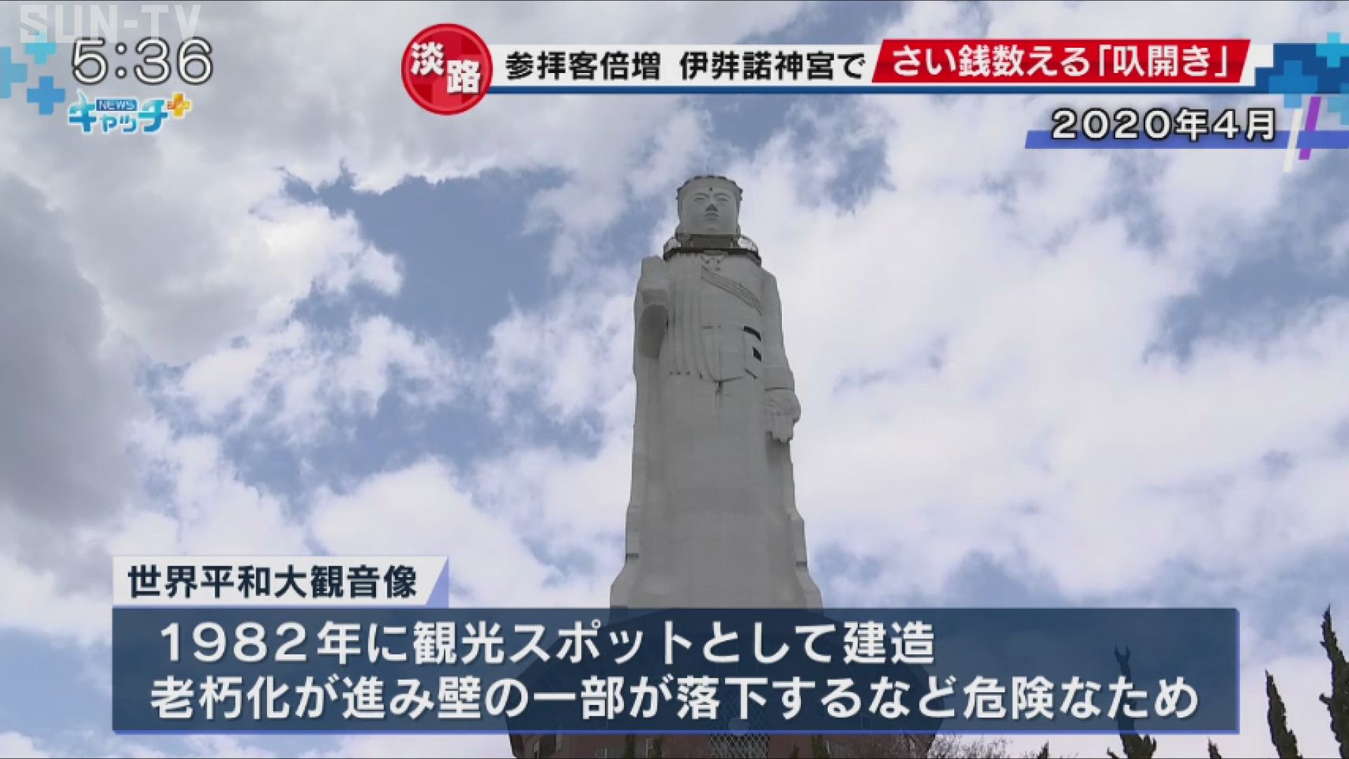 淡路市の高台にそびえたつ高さおよそ100メートルの「世界平和大観音像」。首元まで工事用の足場が組まれ、像全体がすっぽりと覆われています。