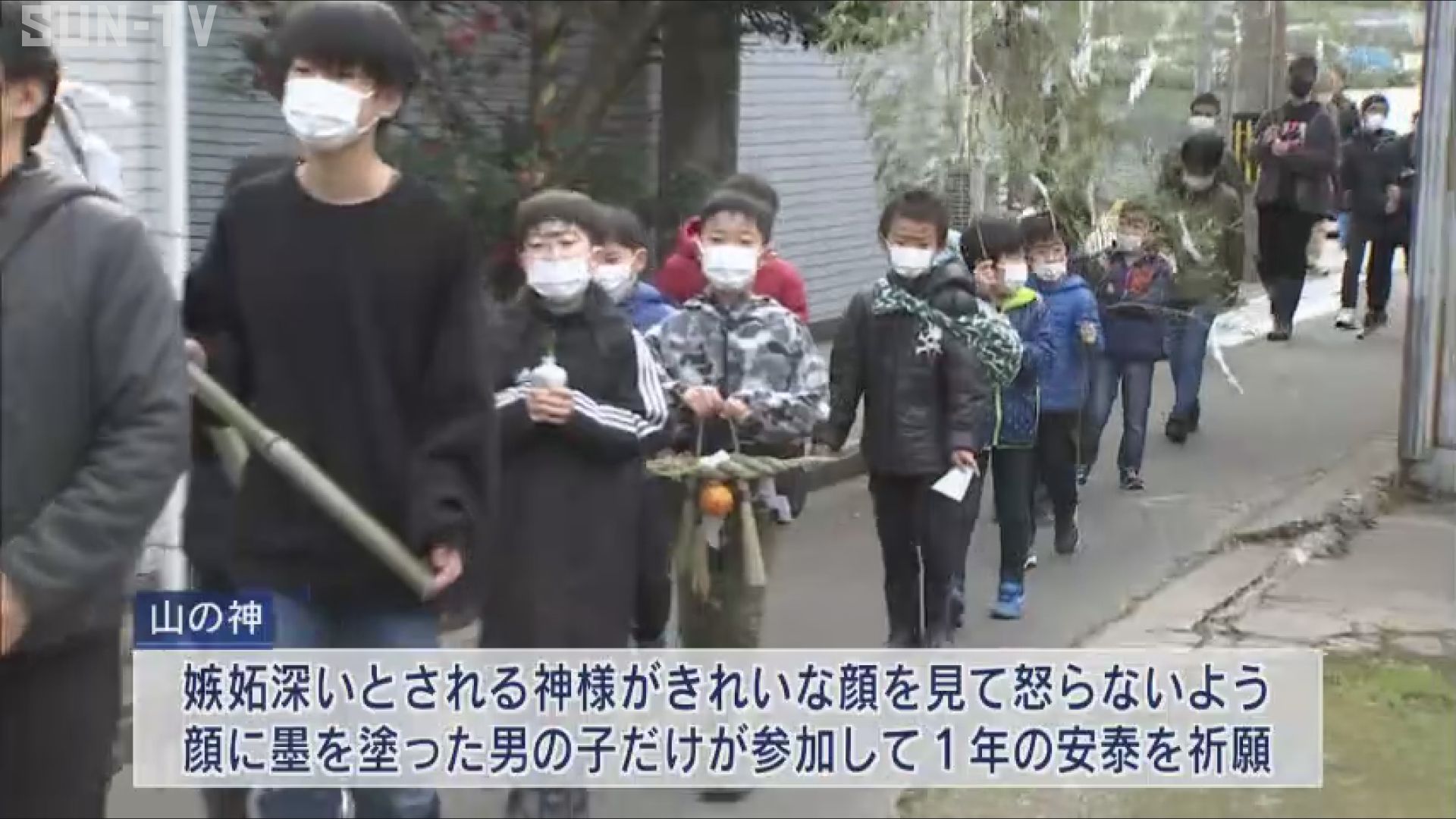 嫉妬深いとされる神様がきれいな顔を見て怒らないよう、顔に墨を塗った男の子だけが参加して、1年の安泰を祈願します。