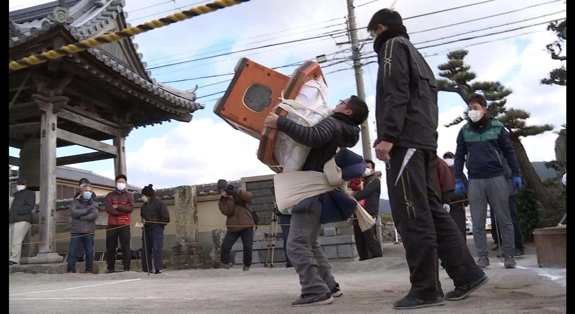 南あわじ市で恒例の大鏡餅運び競争 2022.01.1218:28 地域・まち 南あわじ市で、巨大な鏡餅を抱えて歩く距離を競う、新年恒例の行事が行われました。 南あわじ市の薬王寺で1月12日に行われた「大鏡餅運び競争」。 昭和初期に始まった伝統行事です。 2021年に続き感染対策を取りながら、20代から70代までの力自慢の男性18人が台座も含め173・15キロの鏡餅を持ち上げ、境内を歩く距離を競いました。 結果は、南あわじ市の消防士で34歳の向江弘行さんが125・82メートルを歩き、5年連続の優勝を飾りました。 #南あわじ市 #大鏡餅運び競争 #鏡餅 記事のギャラリーを見る ニュース一覧へ戻る