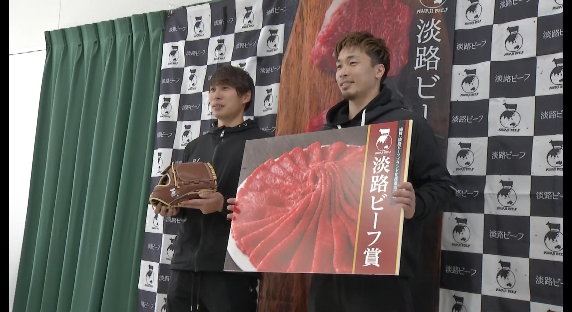 淡路市の屋内練習場ではオリックスの選手たちが、2月からのキャンプを前に自主トレーニングに励んでいて、1月14日に開かれた「淡路ビーフ感謝式典」には、地元出身の村西良太選手をはじめ、安達了一選手や山田修義選手に出席しました。