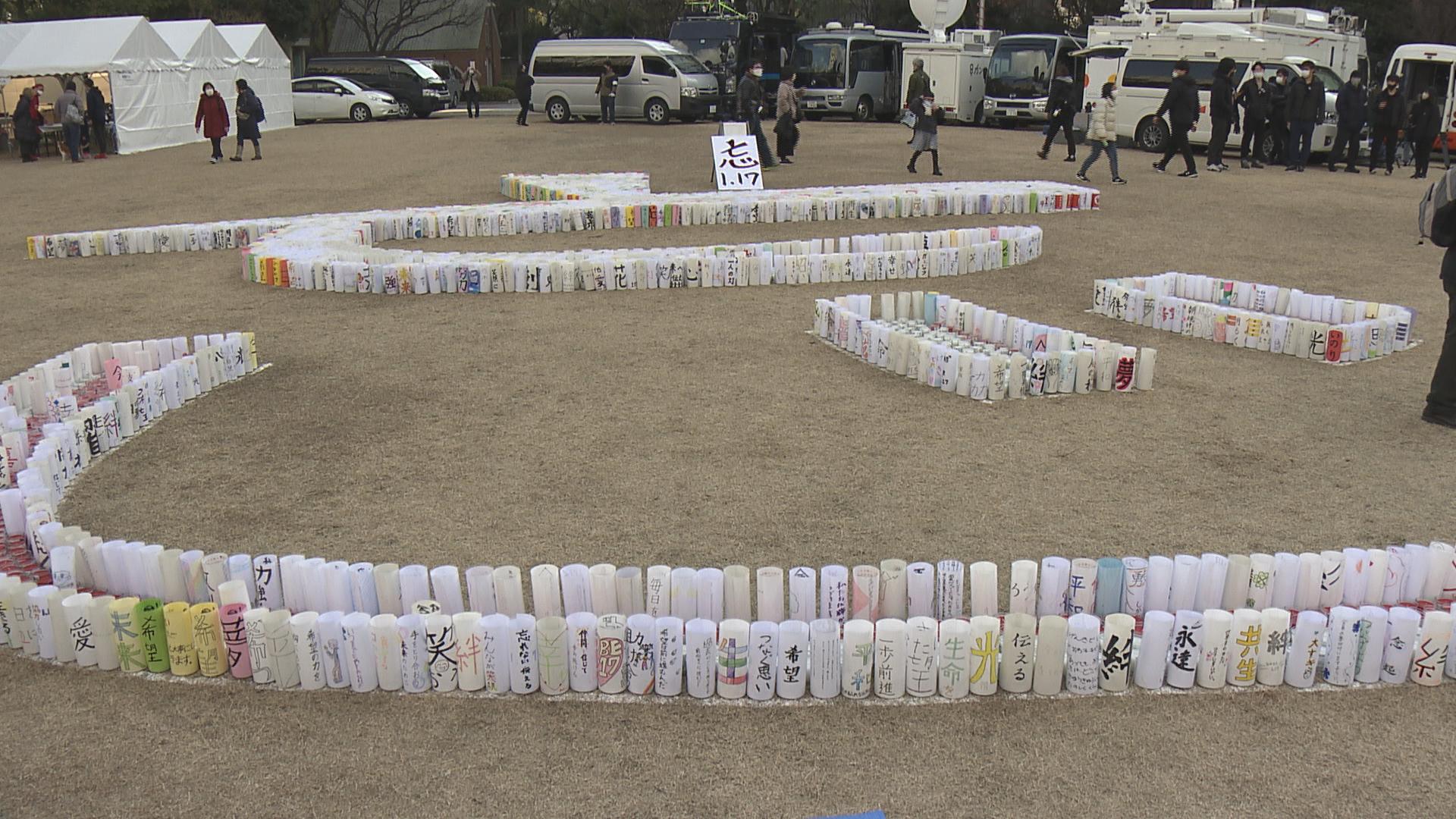 神戸の東遊園地では、毎年1月17日に震災犠牲者を追悼する「1.17のつどい」が開かれ、会場に並べられた灯ろうに灯りがともされます。