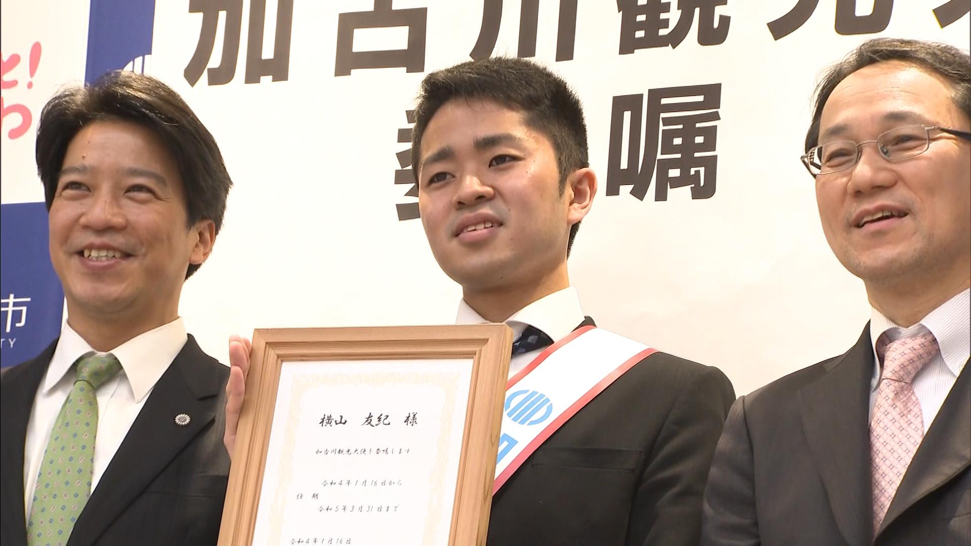 16日は子どもたちが参加する将棋イベントの会場で加古川観光大使の任命式が開かれ、岡田市長から横山さんに委嘱状が手渡されたほか大使の名刺なども贈られました。
