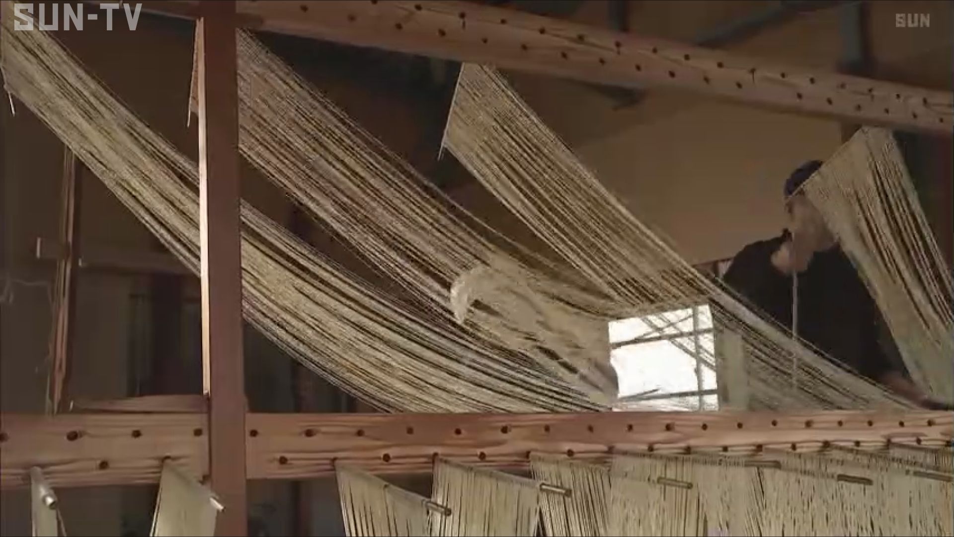 南あわじ市福良の柏木製麺所では午前2時ごろから作業を開始、2本の箸を巧みに操り麺を細長く引き延ばした後、天日で乾燥させています。
