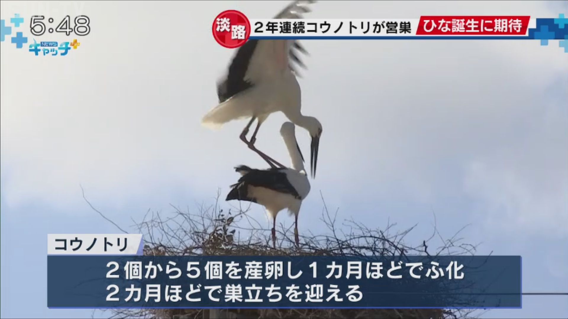淡路市でコウノトリのペアがことしも営巣 地元からはひな誕生を待ち望む声も