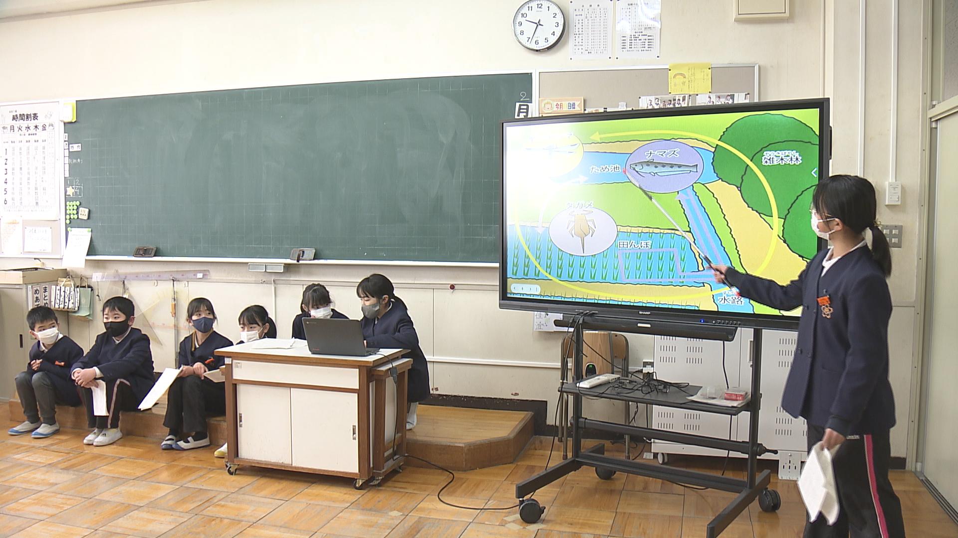 発表者の児童「兵庫県には約2万2000カ所のため池があり、全国一の数です。 全国のため池は約15万4000カ所あり、兵庫県はそのうちの約14%を占めています。 」