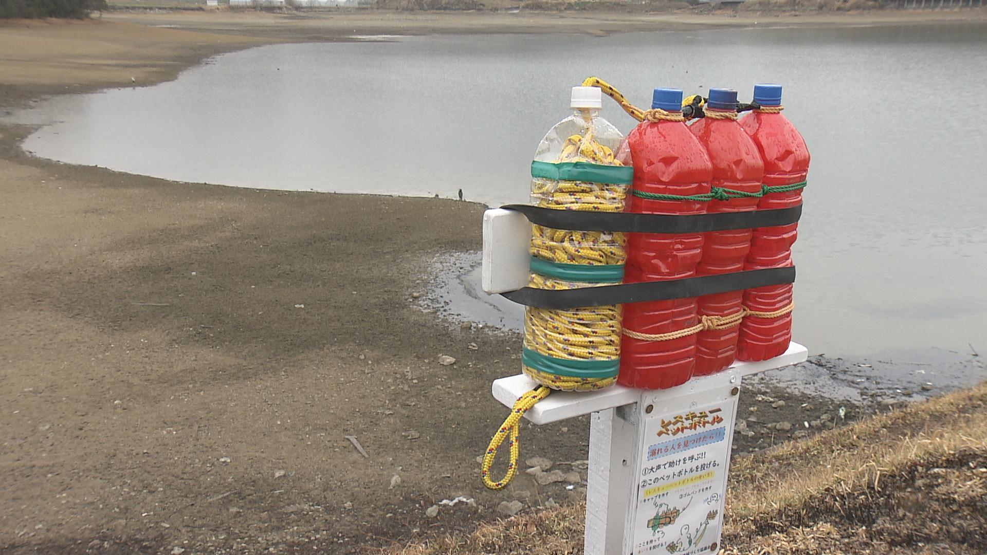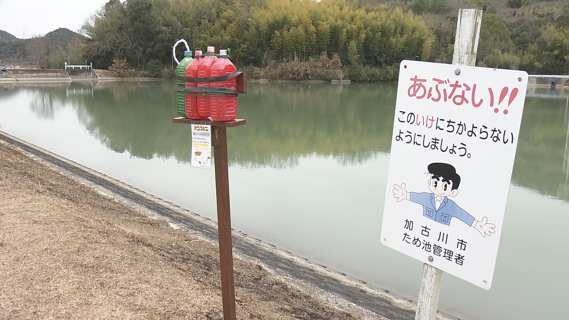 大池に設置されたレスキューペットボトル(加古川市志方町原)