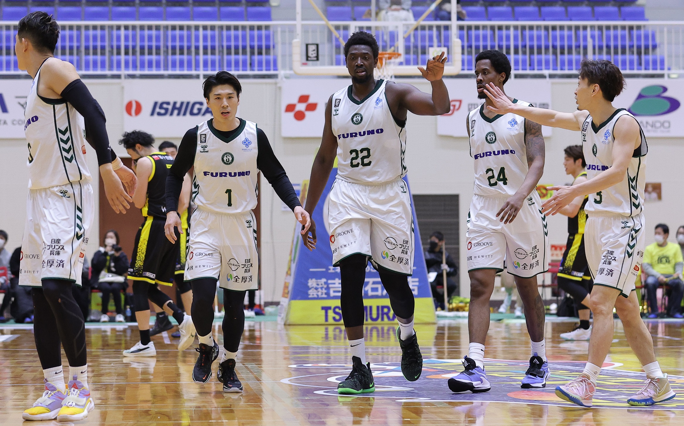 (左から)0川村卓也、1今野翔太、22シェイク・ムボジ、24シャキール・ハインズ、3松崎賢人/(C)B.LEAGUE