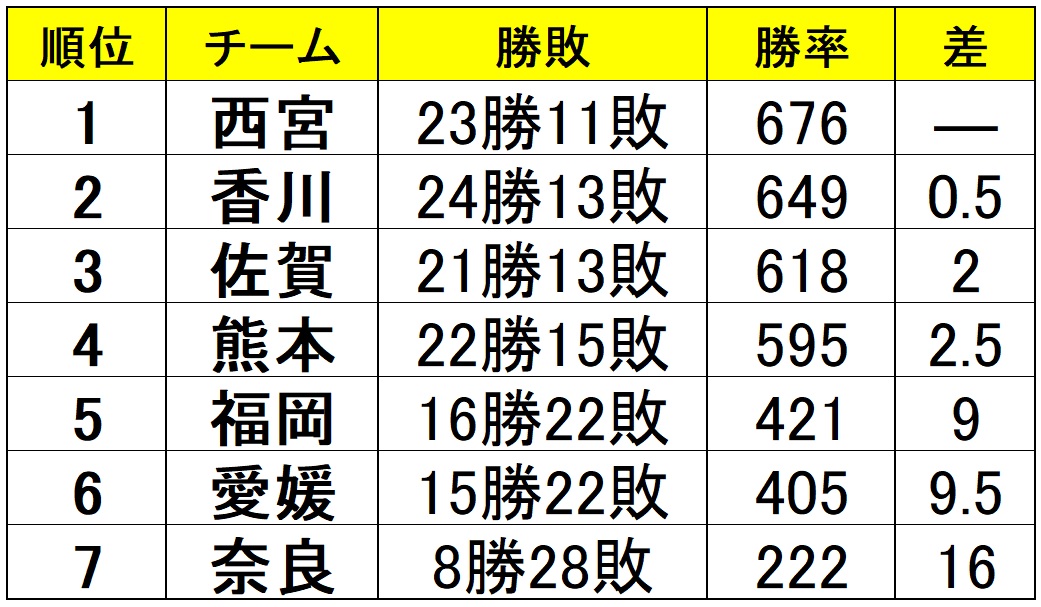 西宮は昨年暮れからの連勝を「10」に伸ばし、勝率で香川を上回って首位に浮上した。