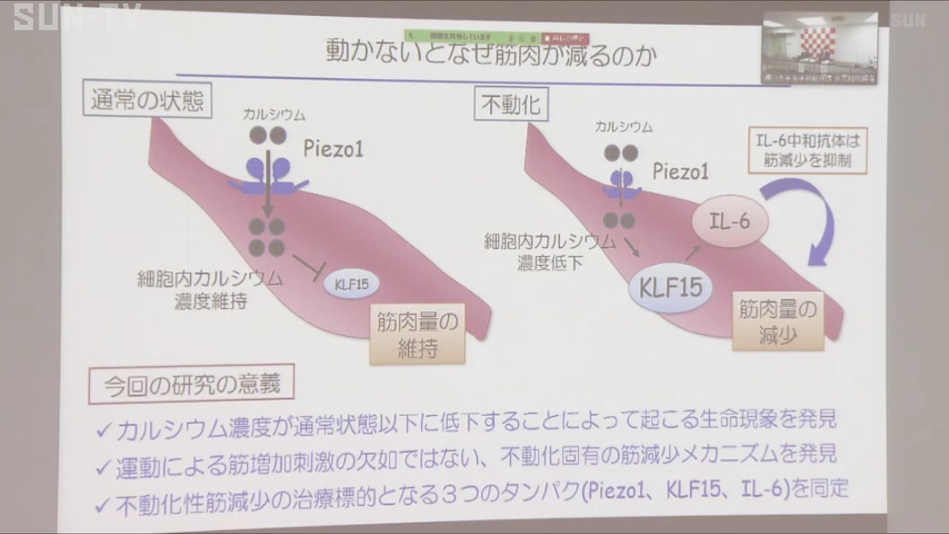 神戸大学大学院の小川渉教授の研究グループは、動物の筋肉内のカルシウム濃度の変化を観察する方法を開発。 マウスや実際に骨折した人の細胞を調べて、筋肉を動かさないとカルシウム濃度が低くなり、筋肉を減らす引き金になることを発見したほか、筋肉内の3種類のタンパクが筋肉を減らす働きをすることなどを突き止めました。