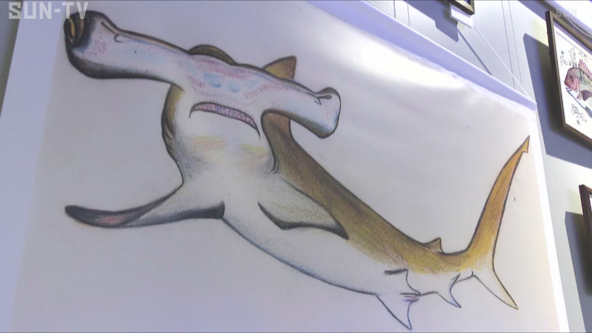 会場では、タレントで画家としても知られるさかなクンが描いた四国水族館で飼育されているアカシュモクザメやマダコなどのイラスト27点が並びます。