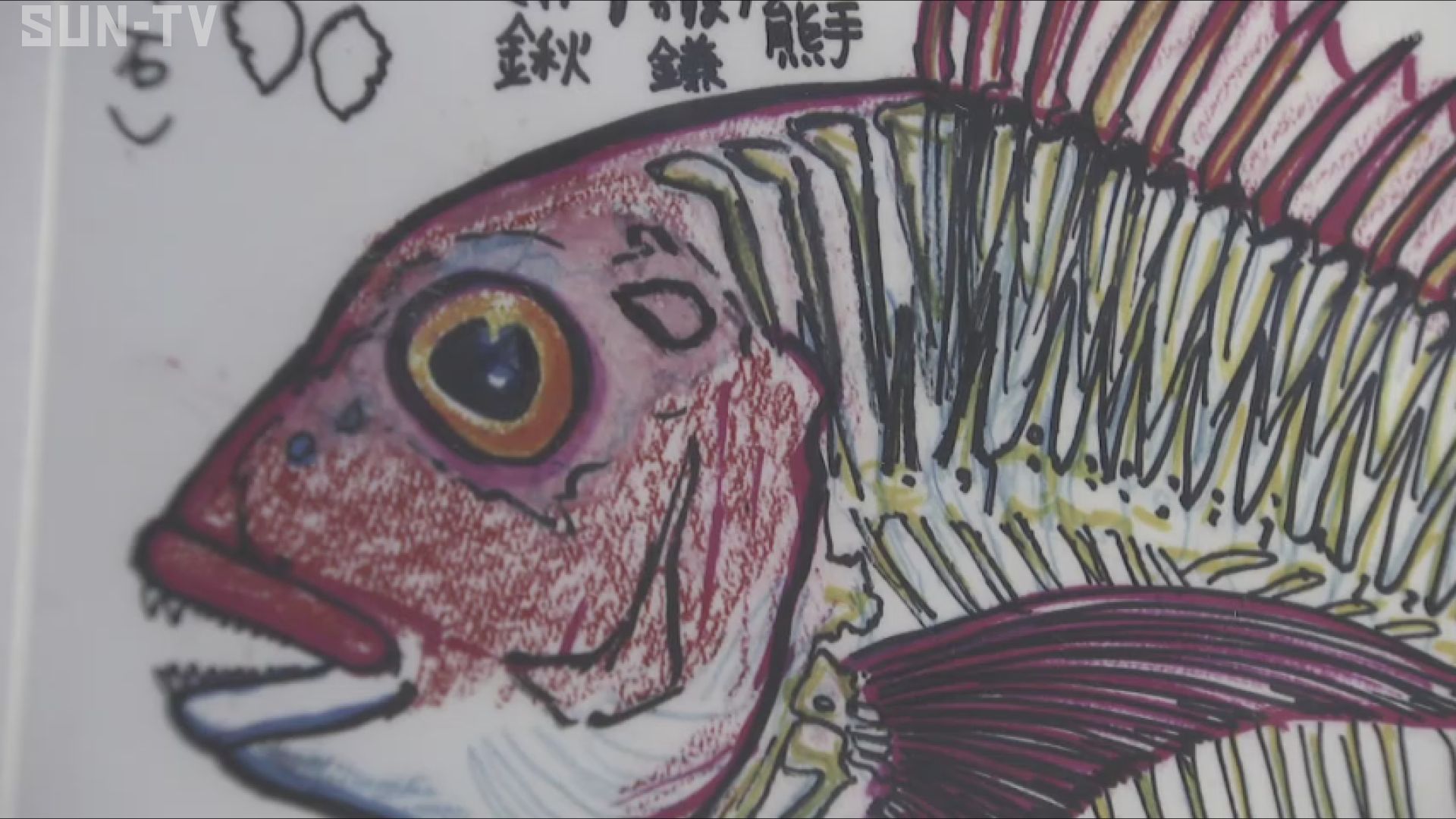 作品は、魚のヒレの形や模様などが細部まで丁寧に描かれているほか、さかなクン自身も登場するユニークなイラストもあり、見る人を楽しませています。