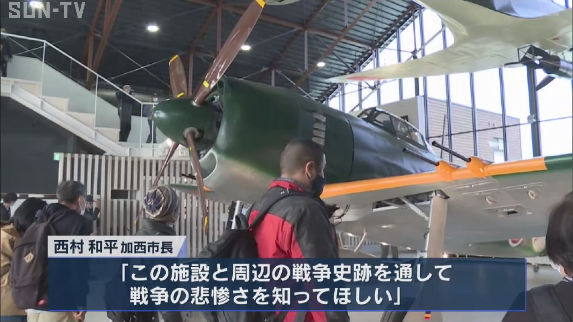 この日は加西市の西村和平(にしむら・かずひら)市長が、「この施設と周辺の戦争史跡を通して戦争の悲惨さを知ってほしい」とあいさつしました。 フロアに置かれた「紫電改(しでんかい)」は、飛行場の近くにあった工場で組み立てられていた戦闘機です。
