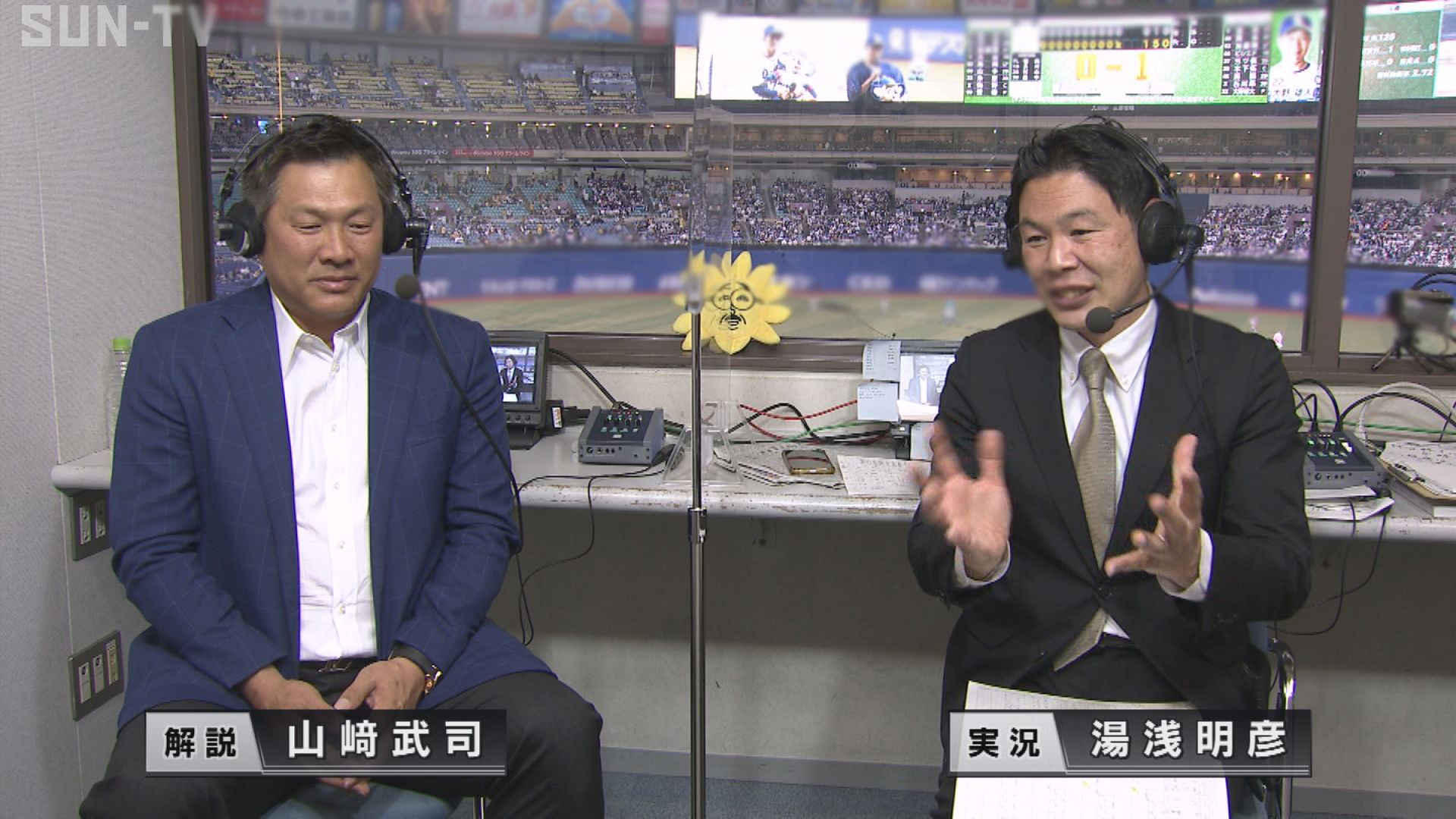 サンテレビボックス席 (左)解説:山崎武司氏、(右)実況:湯浅明彦アナウンサー/バンテリンドーム ナゴヤ