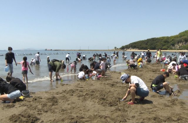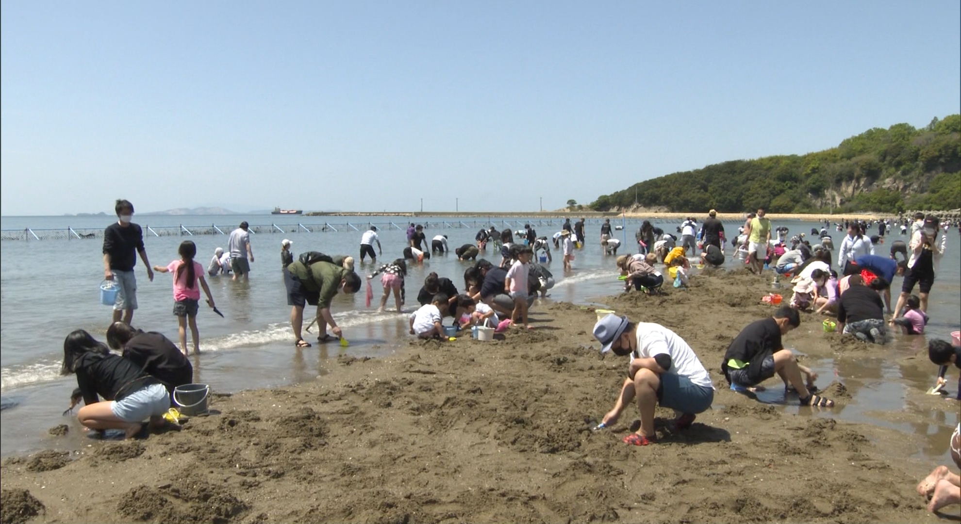 2022年は、休日を中心に多くの家族連れでにぎわっていて、訪れた人たちはスコップや熊手を使って、アサリやハマグリなど、たくさんの貝を探していました。 的形海水浴場の潮干狩りは、6月いっぱい楽しめるということです。