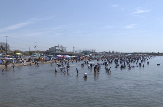 海辺に歓声戻る 的形海水浴場で潮干狩り