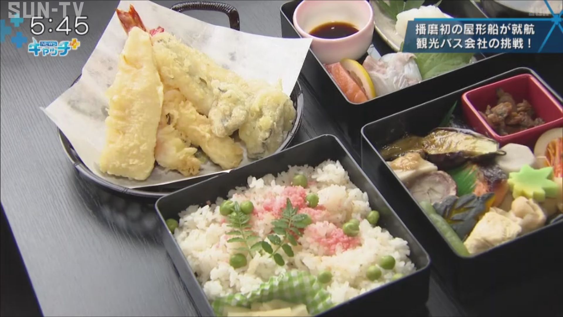 (朝田アナ) 「やっぱり屋形船といえば、食事ですよね。 三段の重箱に入った和食セットには、船内で揚げたばかりのアナゴの天ぷらなど瀬戸内海の海の幸が入っています。 アナゴの天ぷらいただきます。 揚げたてなのでサックサック!中はふわふわで美味しいです。」