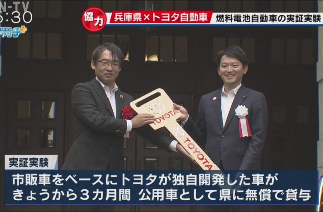 兵庫県は、トヨタ自動車と協力して燃料電池自動車の実証実験を行うと発表し、20日、トヨタが独自に開発した車が県に貸し出されました。