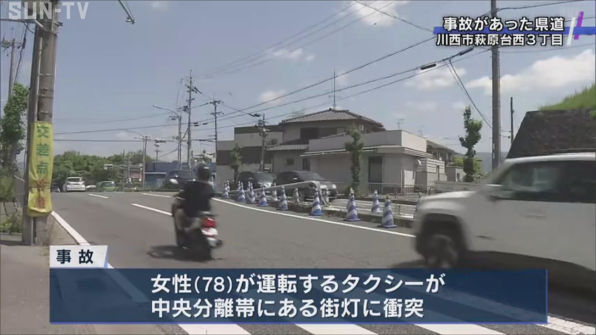 22日夜、川西市の県道で、高齢のドライバーが運転するタクシーが、街灯に衝突する事故があり、乗客がひじの骨を折る重傷を負いました。