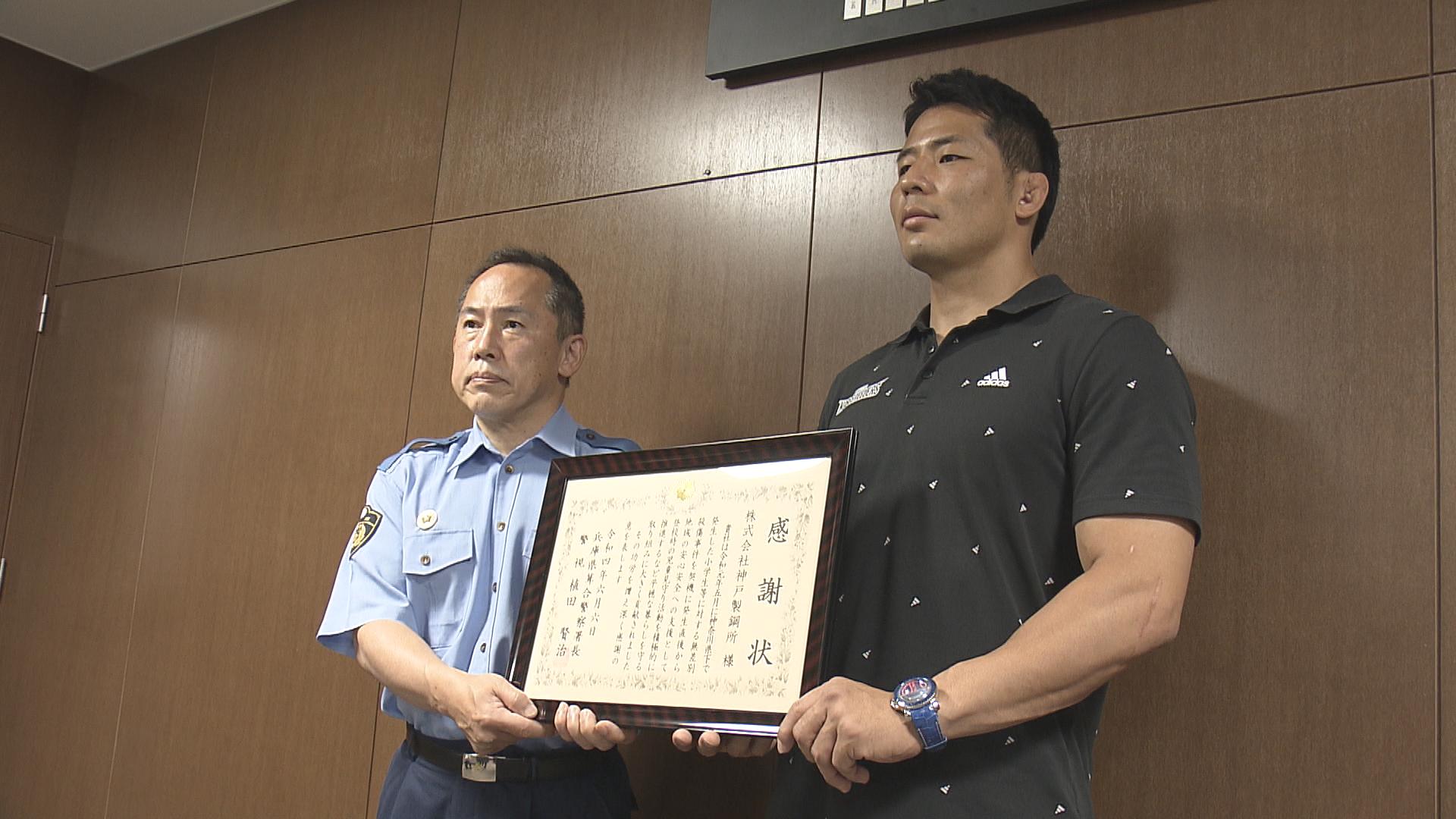 6日午前、ラグビーリーグワン・コベルコ神戸スティーラーズを引退した元キャプテンの橋本大輝さんが葺合警察署を訪れ、植田賢治署長から感謝状を受け取りました。